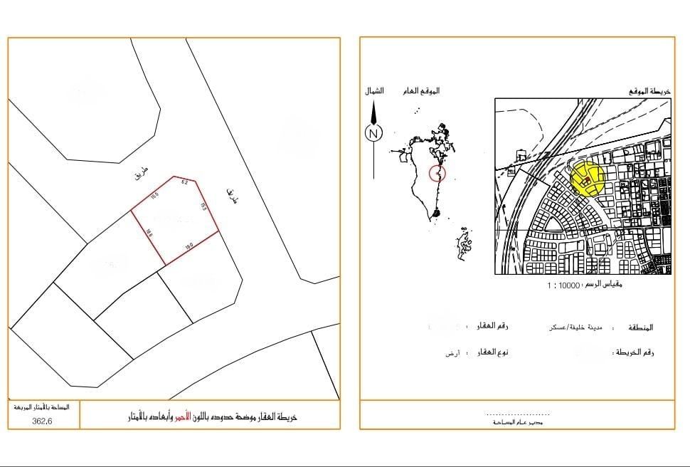 For sale, a land in Askar/ Khalifa City, area 362 SQM, classification RA, price 95 thousand dinars. Basic infrastructure is available and on two streets, corner, very close to the area's entrance and exit (King Hamad Street) near Ali bin Muhammad Al Kaabi Mosque. For contact