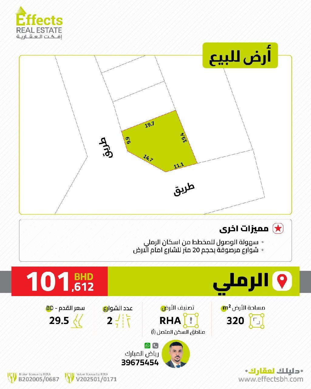 For sale A land plot located in the Al Rumaili area. Land specifications Area of 320 SQM, price per square foot is 29.5 Bahraini dinars. There are two streets, corner classification RHA. Additional advantages easy access to the plan from Al Rumaili housing with paved streets of 20 meters width in front of the land. Total price is 101612 Bahraini dinars