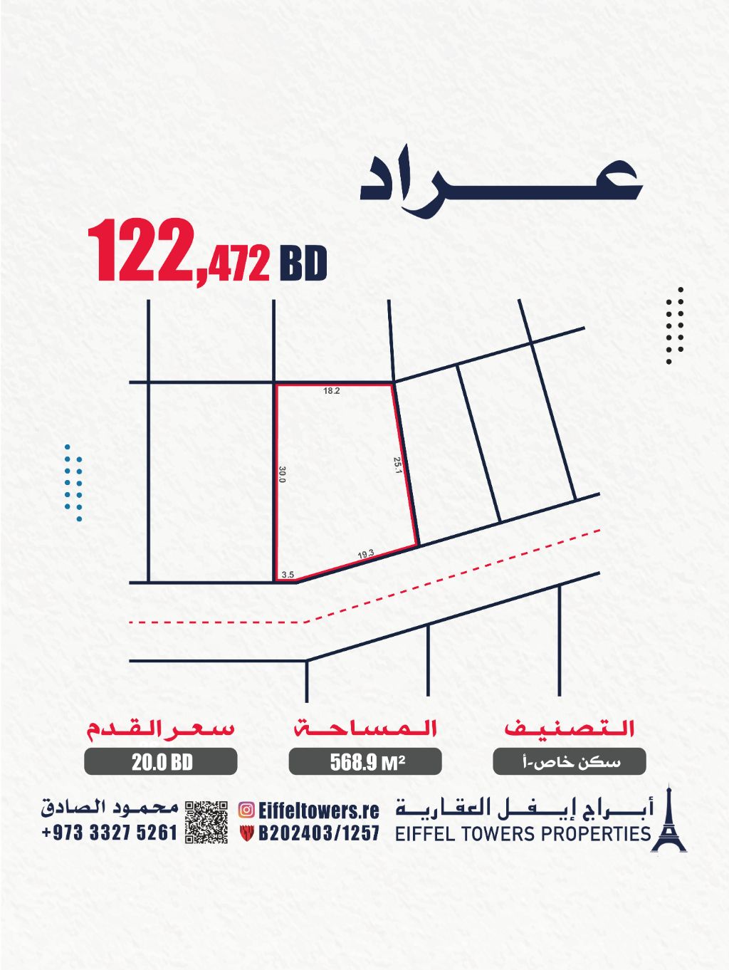 Eiffel Towers Real Estate Company offers for sale a land in Arad with an area of 568.9 square meters, classified as private residential. The price per square foot is 20 BD, and the total price is 122,472 BD. For contact, reach out to Mahmoud Al-Sadiq via eiffeltowers.re. This is a broker certified by the Real Estate Regulatory Authority with license number B202403/1257.