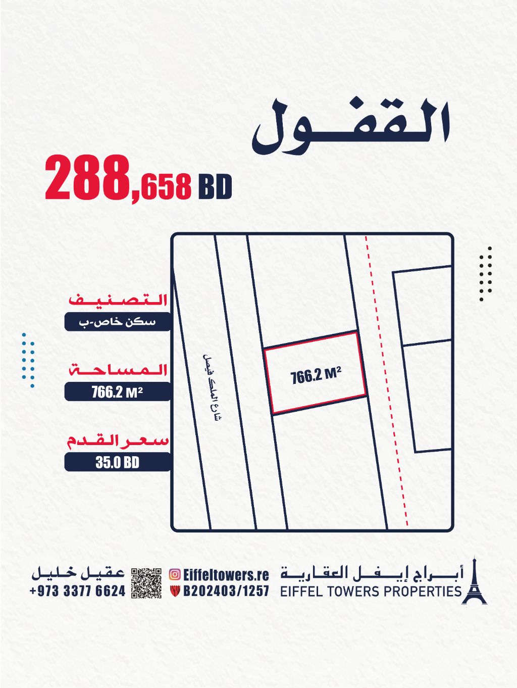 Eiffel Towers Real Estate Company offers for sale a land plot in Al Qafool with an area of 766.2 square meters, classified as private residential. The price per square foot is 35 Bahraini dinars, and the total price is 288,658 Bahraini dinars. For contact, reach out to Aqeel Khalil via eiffeltowers.re. The company is a certified broker by the Real Estate Regulatory Authority with license number B202403/1257.