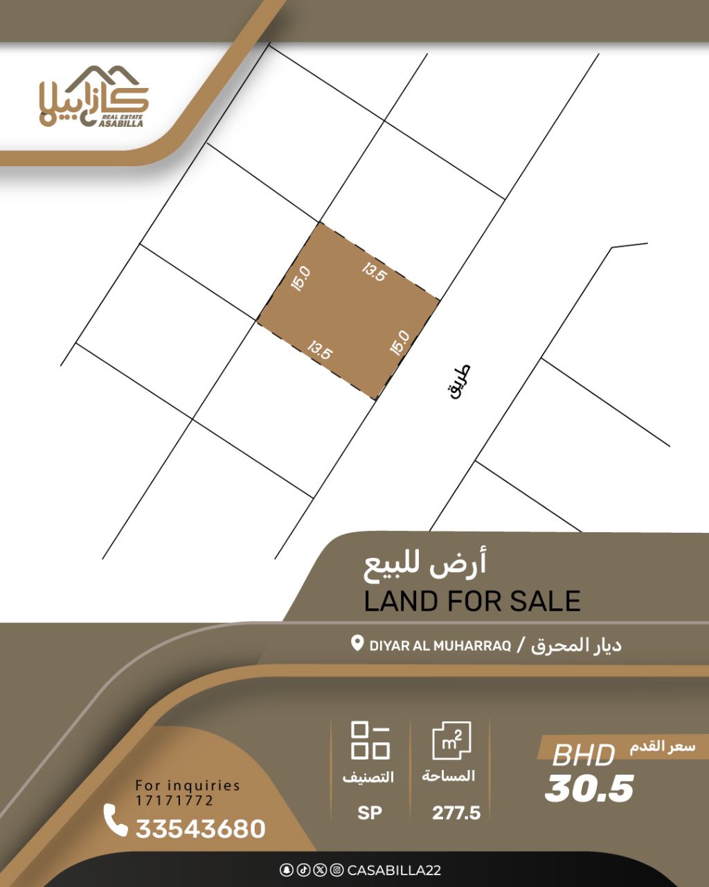 For sale, a distinguished land in the Diyar Al Muharraq area. Prime location near Souq Al Baraha. Services are available. Price per square foot is 30.5. Classification: Sp. Area: 277.5. Total price: 91,103 Bahraini dinars. For contact.