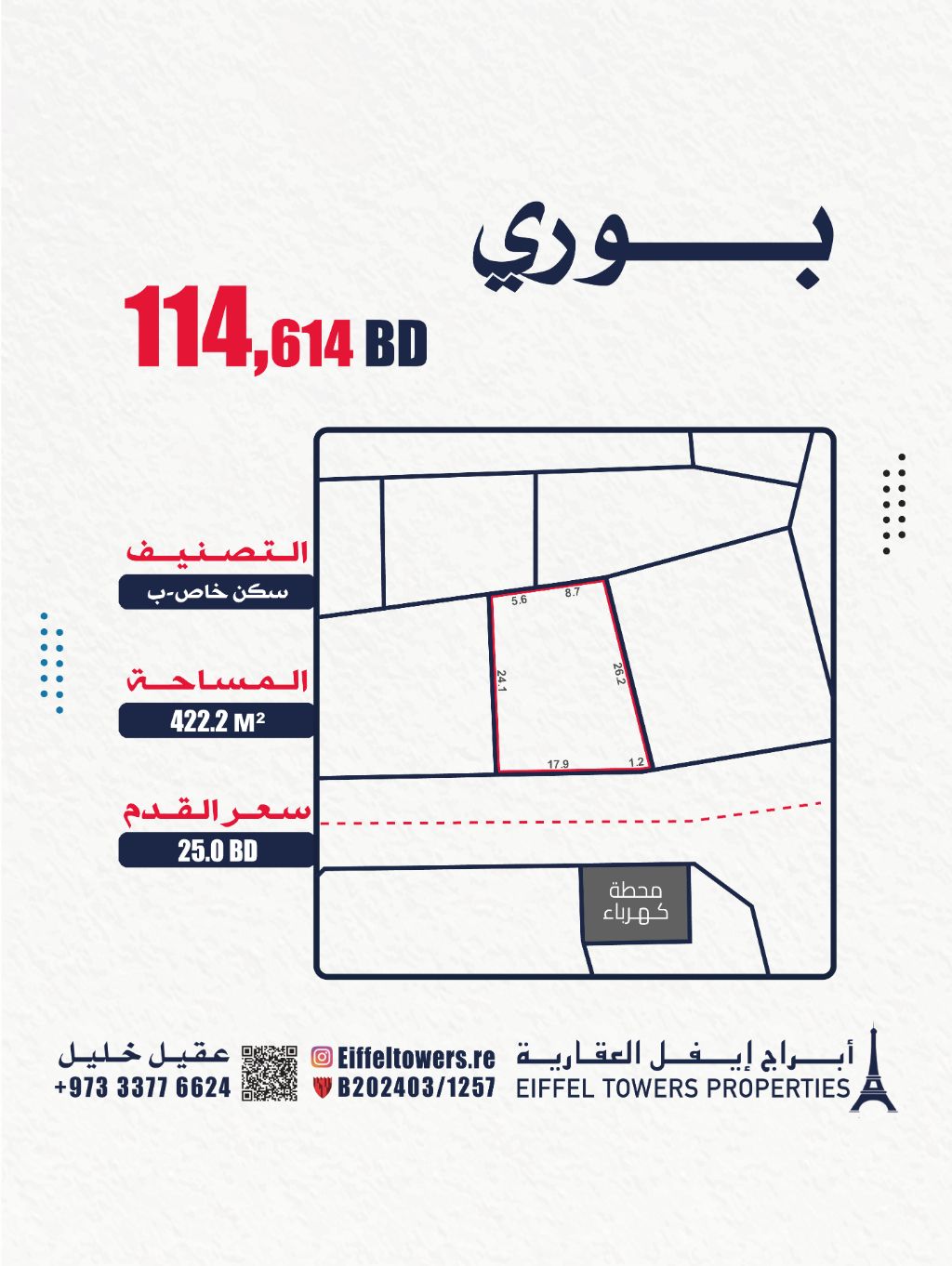 Eiffel Towers Real Estate Company offers for sale a land in Bouri with an area of 422.2 square meters, classified as private residential. The price per square foot is 25 Bahraini dinars, and the total price is 114,614 Bahraini dinars. For contact, Aqeel Khalil at eiffeltowers.re. The company is a certified broker by the Real Estate Regulatory Authority with license number B202403/1257.