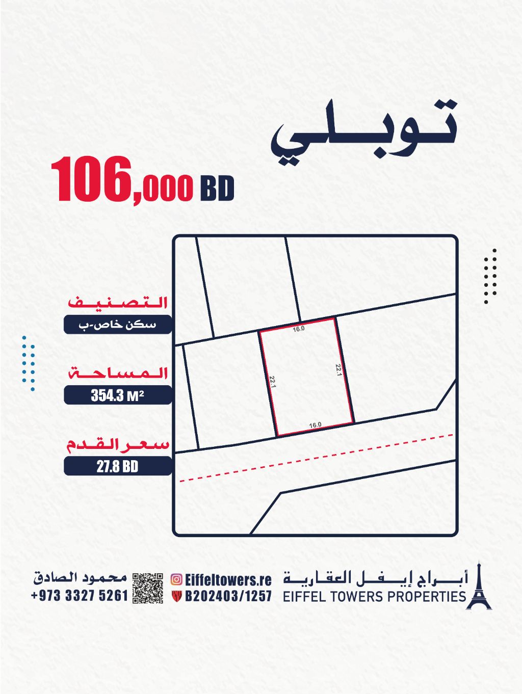 Eiffel Towers Real Estate Company offers for sale a land in Tubli with an area of 354.3 square meters, classified as private residential. The price per square foot is 27.8 Bahraini dinars, and the total price is 106,000 Bahraini dinars. For contact, reach out to Mahmoud Al-Sadiq via eiffeltowers.re. The company is an accredited broker by the Real Estate Regulatory Authority with license number B202403/1257.