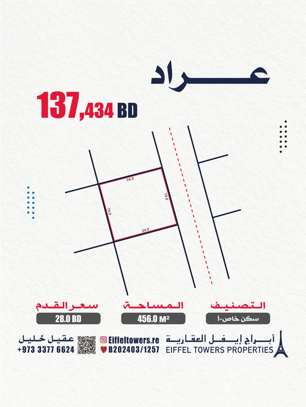 Eiffel Towers Real Estate Company offers for sale a land in Arad with an area of 456 square meters, classified as private residential (RA). The price per square foot is 28 BD, and the total price is 137,434 BD. For contact, Aqeel Khalil at eiffeltowers-re. Eiffeltowers.re is an intermediary licensed by the Real Estate Regulatory Authority with license number B202403/1257.