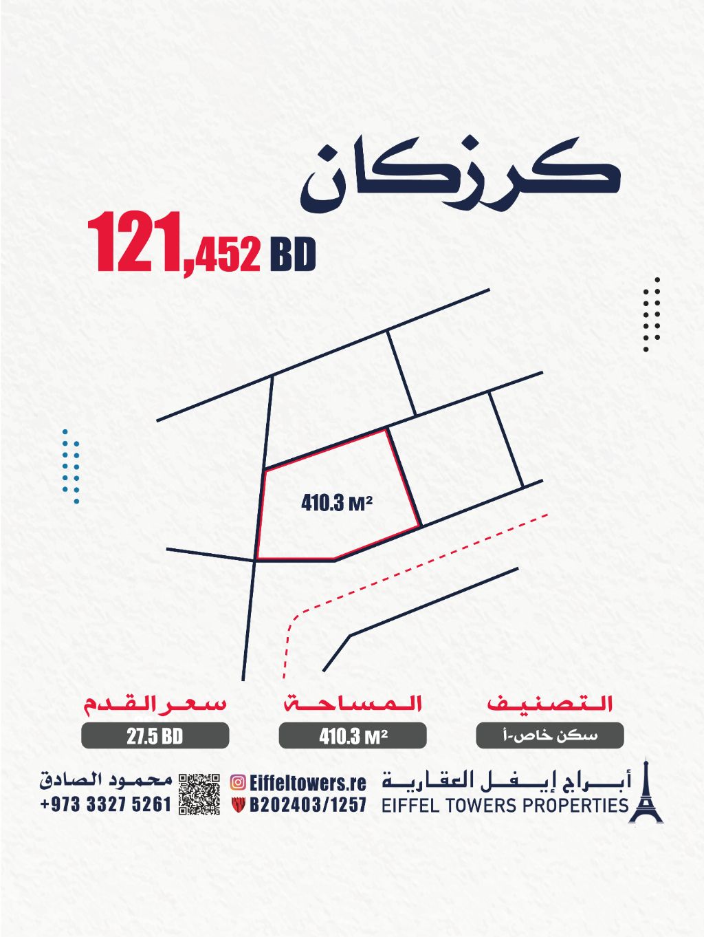 Eiffel Towers Real Estate Company offers for sale a land in Karzakhan with an area of 410.3 square meters, classified as private residential (A RA). The price per square foot is 27.5 BD, and the total price is 121,452 BD. For contact, reach out to Mahmoud Al-Sadiq via eiffeltowers.re. The company is an intermediary certified by the Real Estate Regulatory Authority with license number B202403/1257.