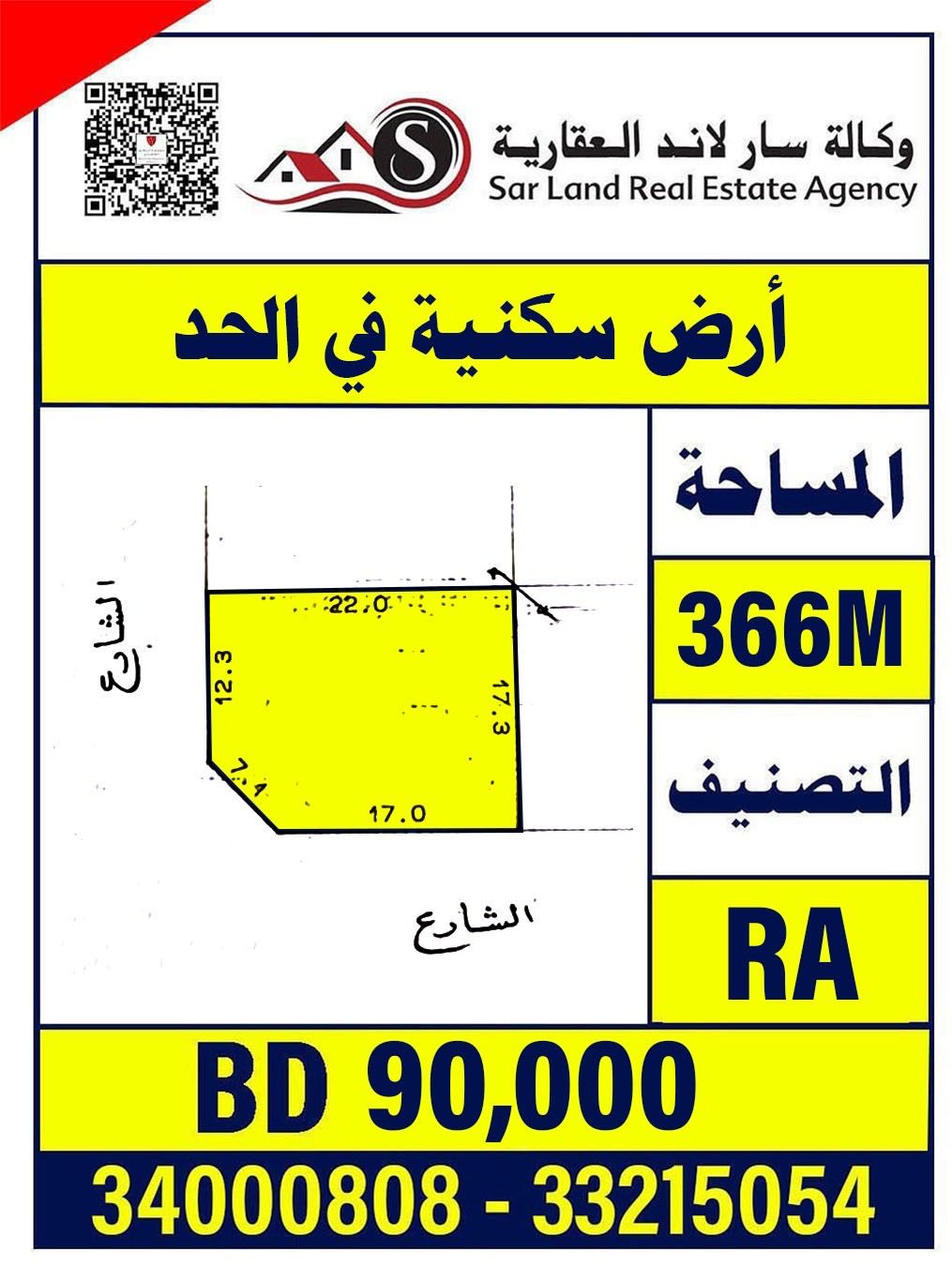 A vacant land in Al-Hidd with an area of 366 square meters, classified as RA, final price 90,000 BHD.