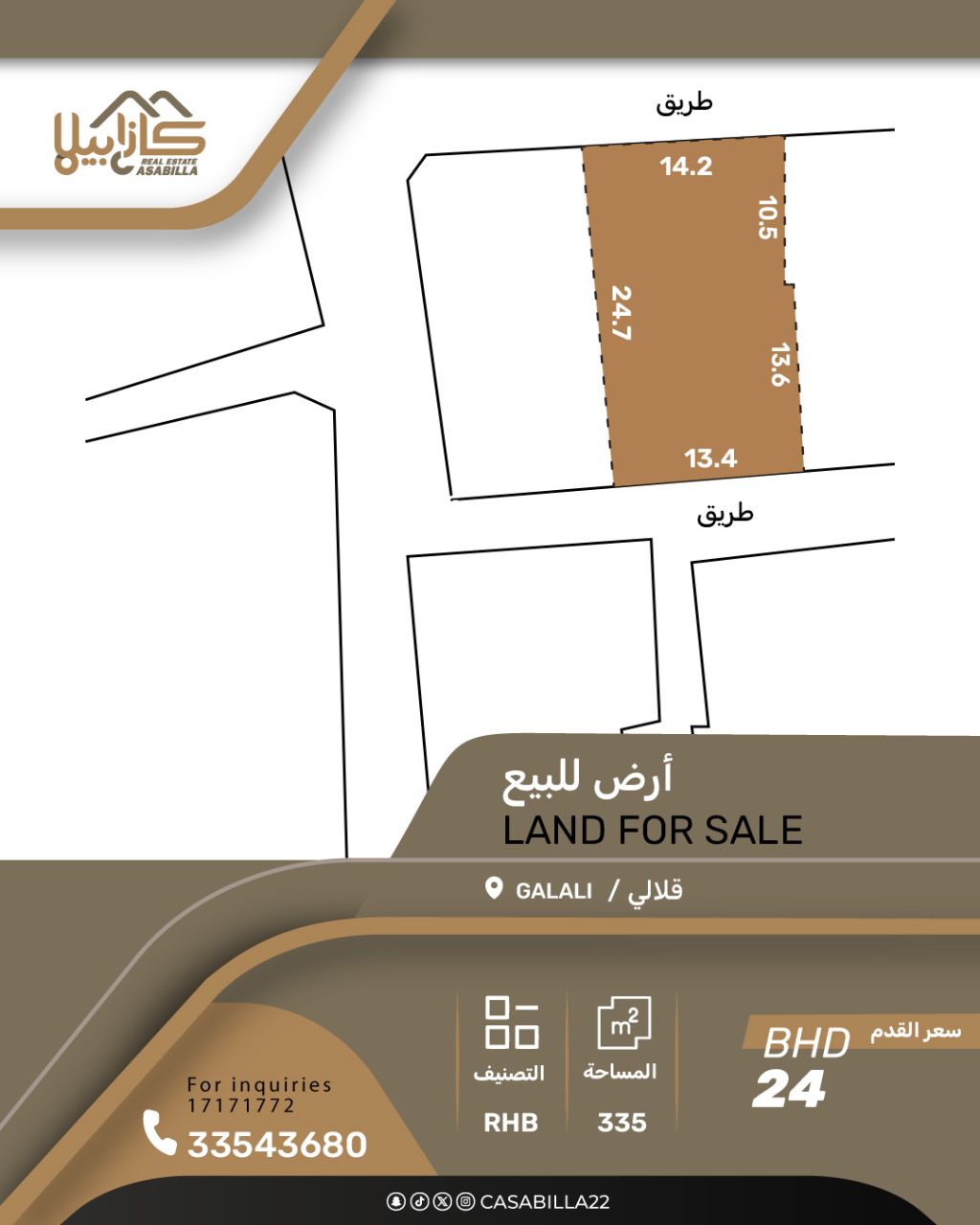 For sale: A land in Qalali suitable for building 3 floors, classified as RHB. Land area is 335 square meters, price per foot is 24 dinars, total price is 87,000 dinars. For contact.