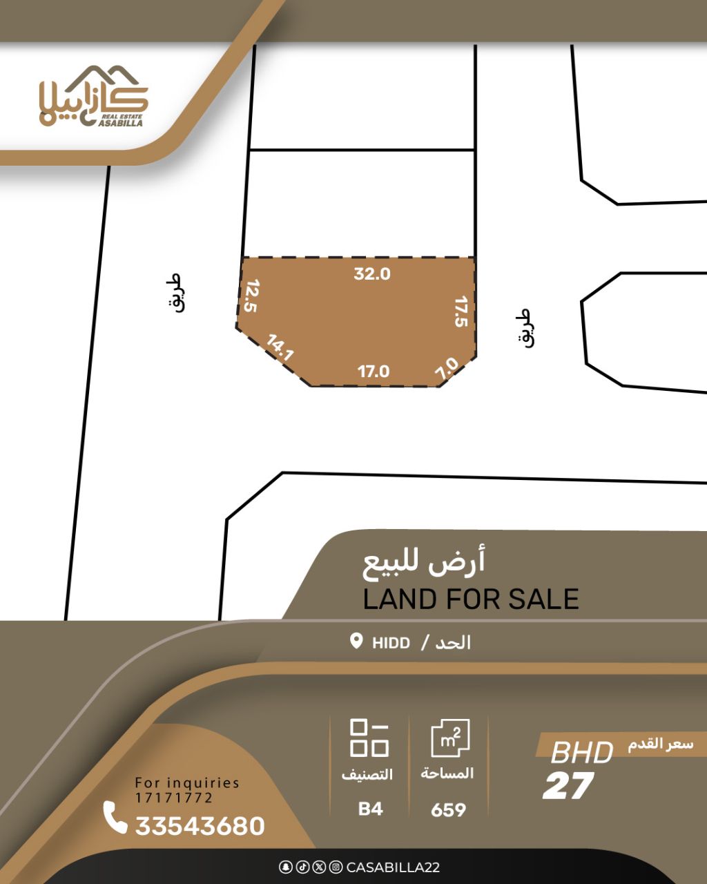 For sale, a land in a prime location in Al-Hidd area, classification B4, area 659 square meters, price per foot 27 dinars, total price 191 thousand dinars. For contact.