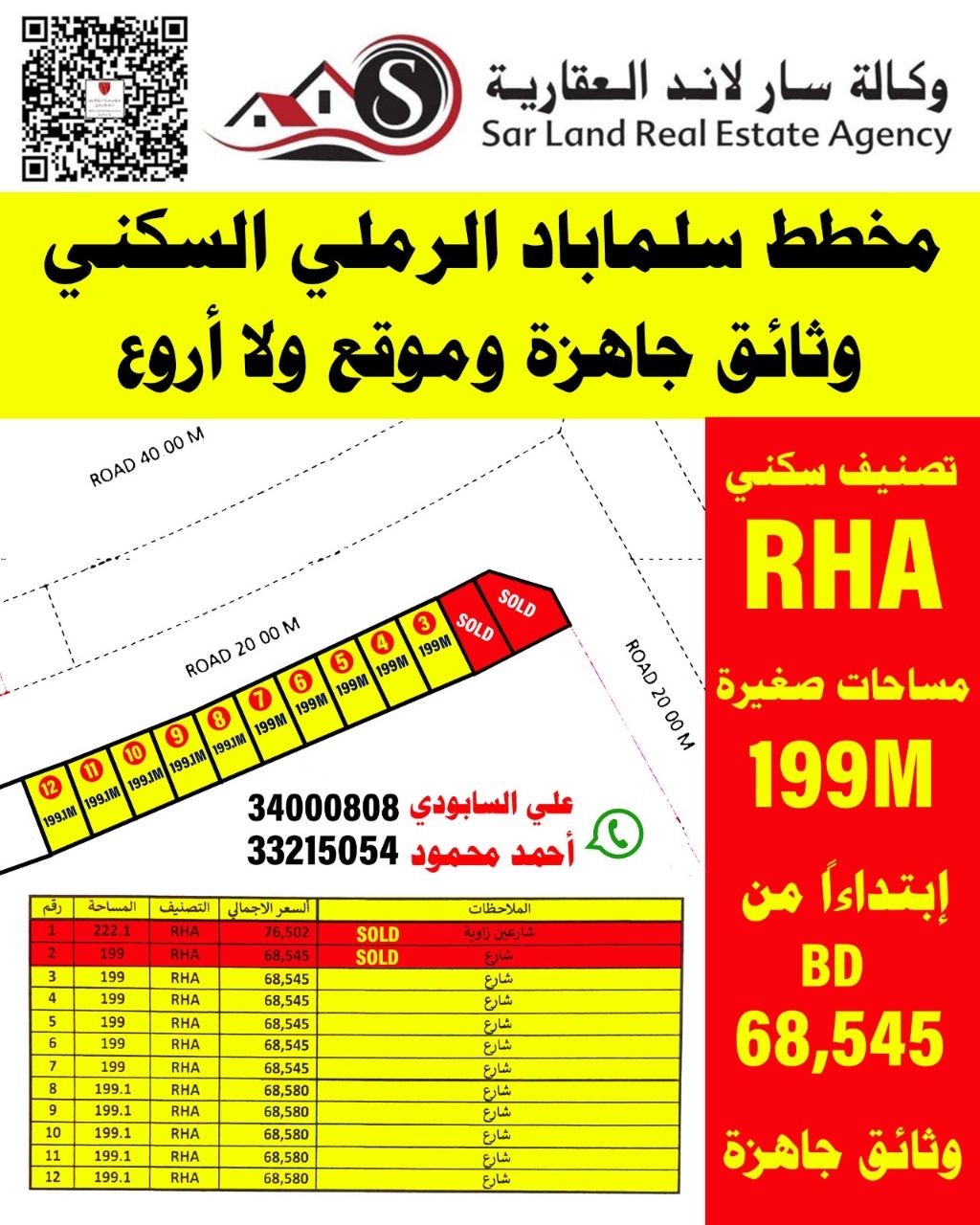 Al Ramli New Subdivision, excellent location, affordable prices, desirable plot sizes of 199 square meters, price 68,545 thousand dinars, classification RHA, hurry to book.