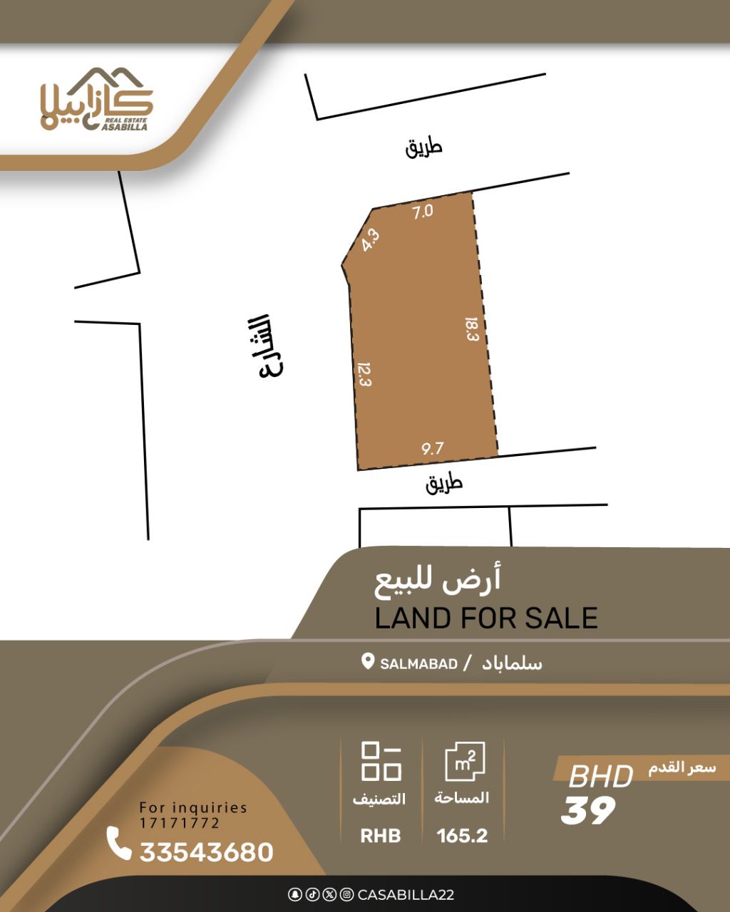 For sale: A land in the Salmabad area. Details: Land area 165.2, land classification RHB, connected residential areas. Land price 69 thousand dinars. For contact.