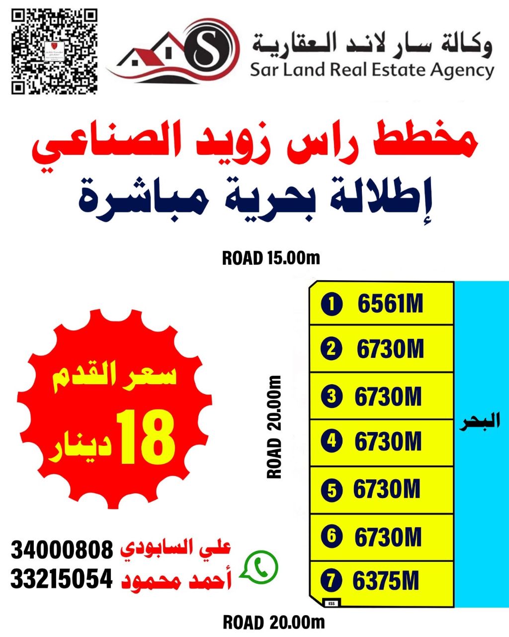 Distinguished industrial lands in Ras Zuwayd, directly on the sea. The area is 6730 square meters. The price is 18 dinars per foot. Agency: Sar Land Real Estate.