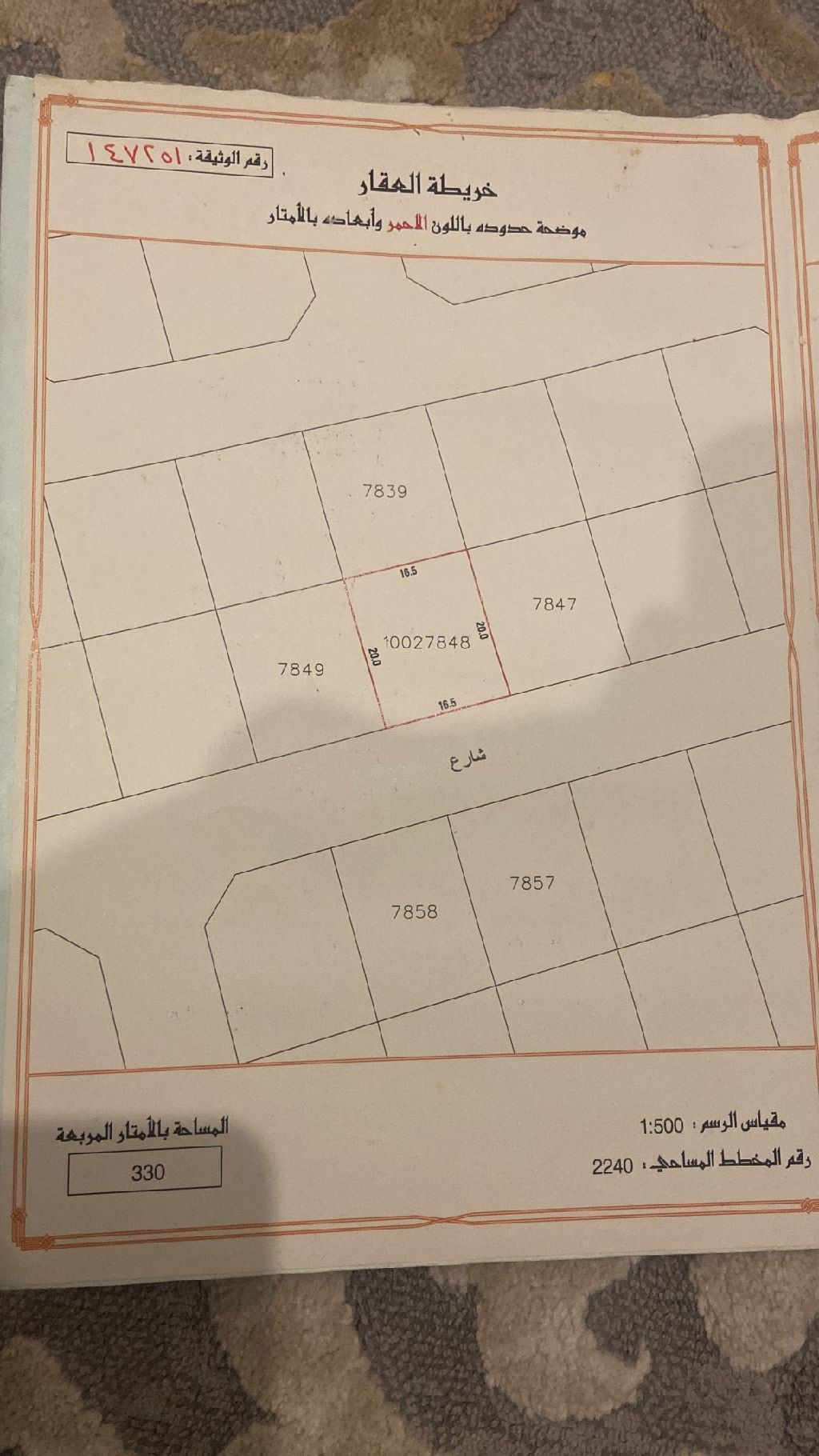 For sale: A distinguished land in the Shahrakan area, located near the Al Reef complex. The land area is 330 square meters, with a foot area of 3552 square feet. The price per square foot is 26.8 thousand dinars, totaling 95,000 thousand dinars. It has a wide frontage of 16.5 meters and a depth of 20 meters. The land is classified as private residential areas (RB) and is suitable for building a luxury villa. Contact Damacbh for inquiries.