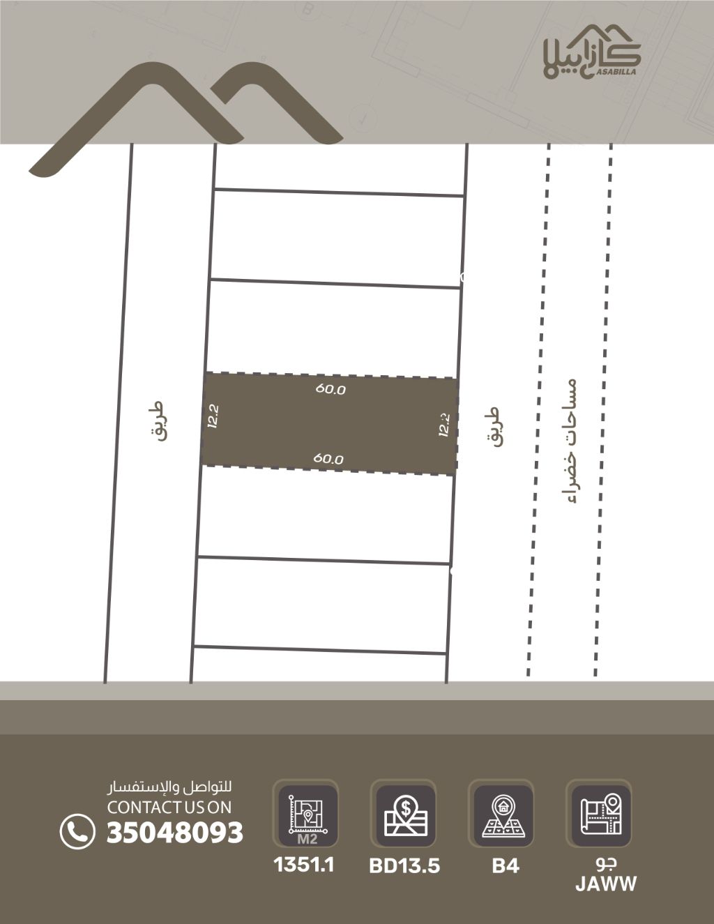 For sale: A land in Jow area. Land area is 1351.1 square meters. Land classification is B4. Sale price is 200,000 dinars. Price per square foot is approximately 13.75 dinars. For contact.