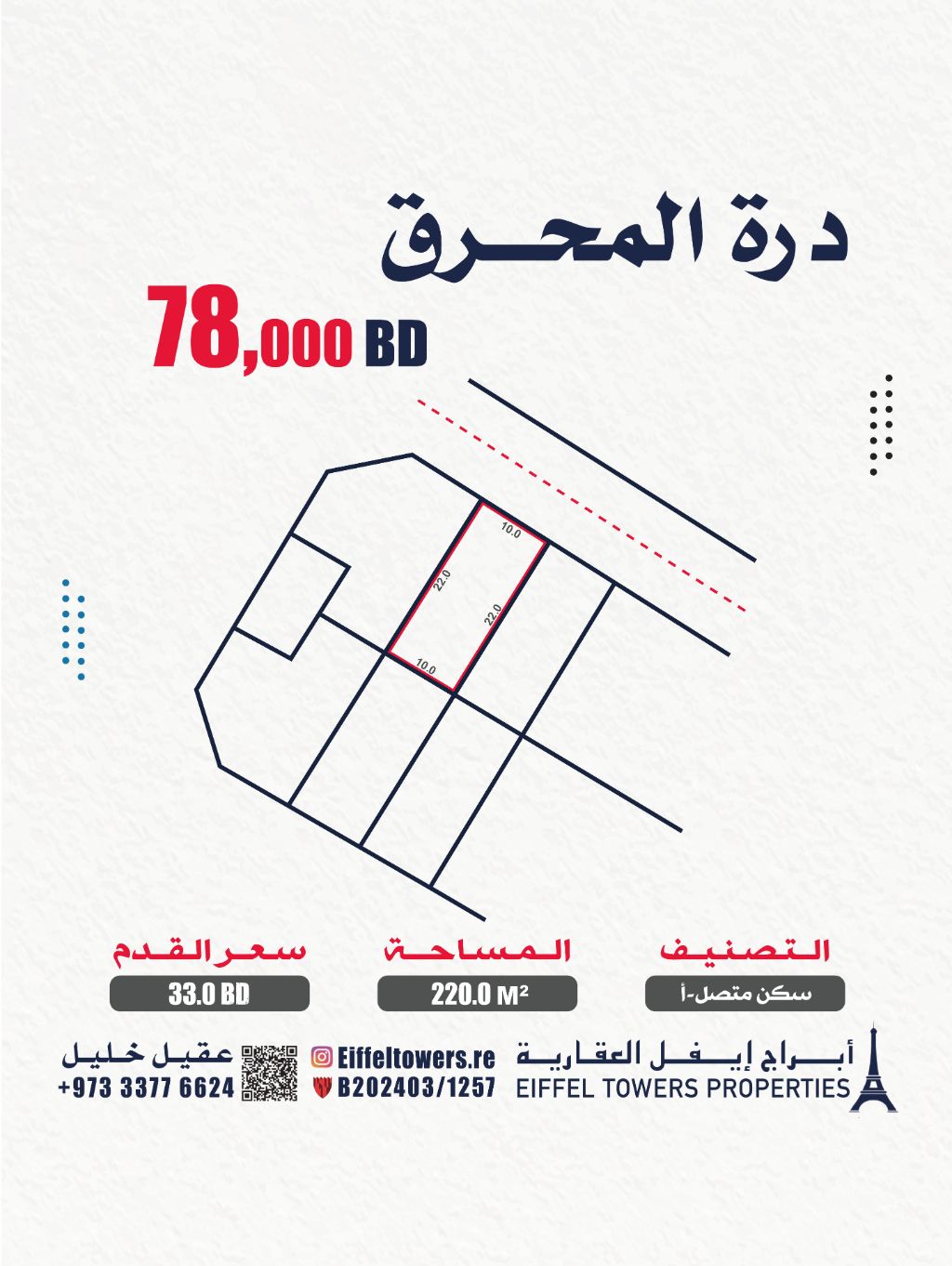 Eiffel Towers Real Estate Company offers for sale a land in Durrat Al Muharraq with an area of 220 square meters, classified as residential connected. The price per square foot is 33 Bahraini dinars, and the total price is 78,000 Bahraini dinars. For contact, Aqeel Khalil at eiffeltowers.re. The company is an intermediary certified by the Real Estate Regulatory Authority with license number B202403/1257.
