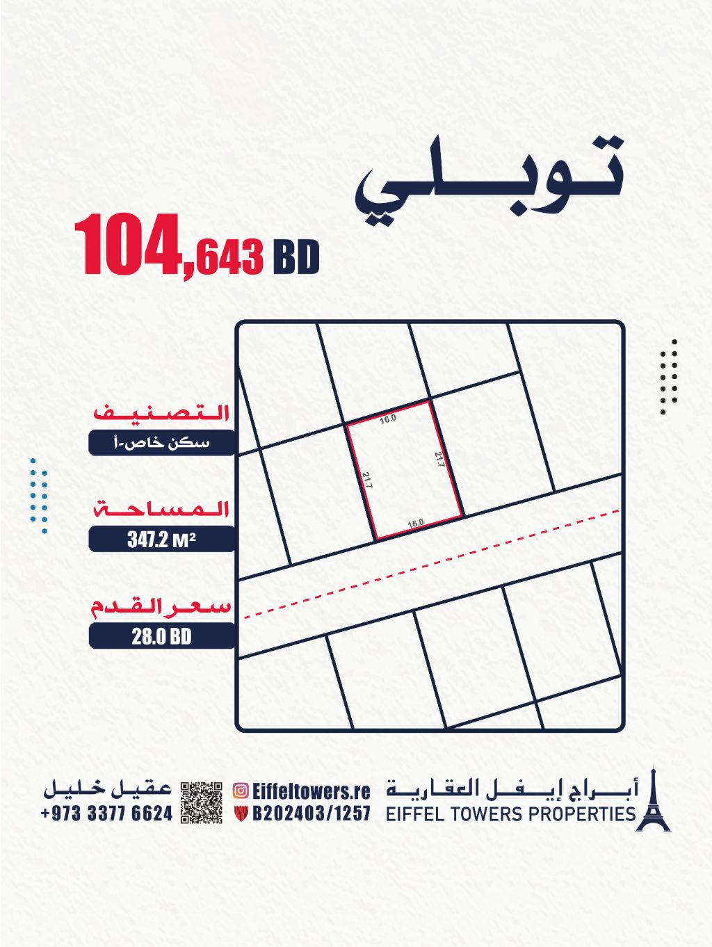 Eiffel Towers Real Estate Company offers for sale a land in Tubli with an area of 347.2 square meters, classified as private residential. The price per square foot is 28 Bahraini dinars, and the total price is 104,643 Bahraini dinars. For contact, Aqeel Khalil at eiffeltowers-re. The company is a certified broker by the Real Estate Regulatory Authority with license number B202403/1257.