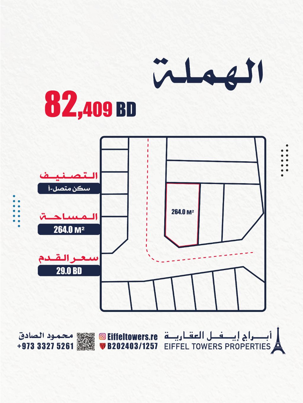 Eiffel Towers Real Estate Company offers for sale a land in Al Hamla with an area of 264 square meters, classified as attached residential (ARHA). The price per square foot is 29 Bahraini dinars, and the total price is 82,409 Bahraini dinars. For contact, reach out to Mahmoud Al-Sadiq via eiffeltowers.re. This is a broker certified by the Real Estate Regulatory Authority with license number B202403/1257.