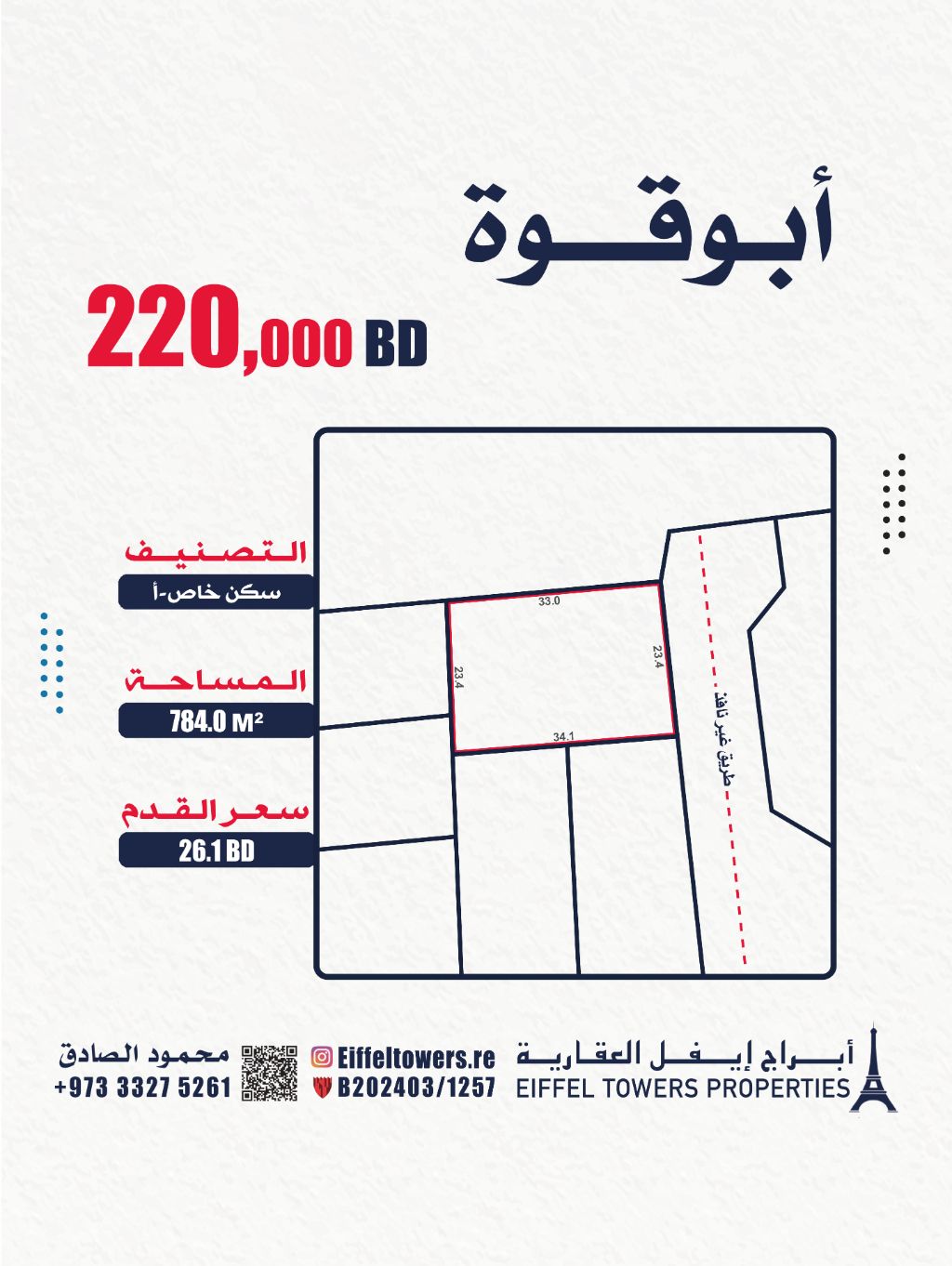 Eiffel Towers Real Estate Company offers for sale a land in Abu Quwa with an area of 784 square meters, classified as private residential. The price per square foot is 26.1 Bahraini dinars, and the total price is 220,000 Bahraini dinars. For contact, reach out to Mahmoud Al-Sadiq via eiffeltowers.re. The company is an intermediary certified by the Real Estate Regulatory Authority with license number B202403/1257.