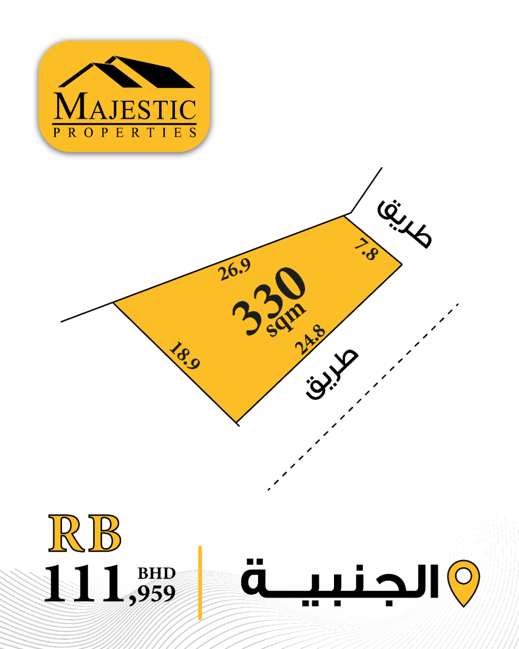 For sale: A residential and investment land in Janabiya on two streets and a corner, near Janabiya Square. Land classification: RB. Land area: 330.2 square meters. Price per square foot: 31.5 Bahraini dinars. Total price: 111,959 Bahraini dinars. Reference: MPM3286.