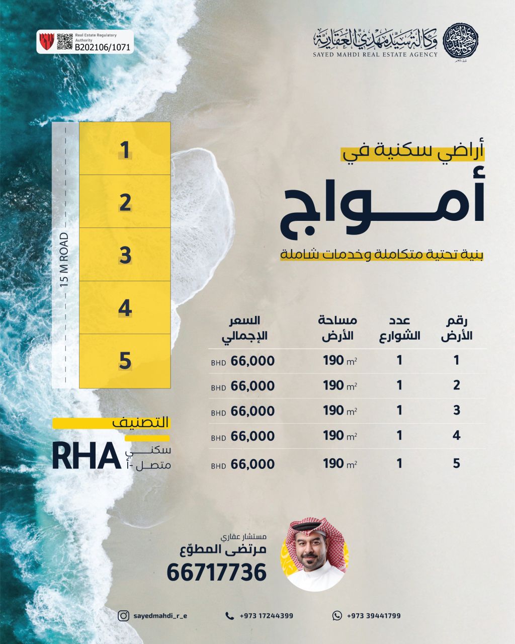 Lands in a prime location, Amwaj. Price 66000 dinars. Prime location. Freehold ownership. For more details, contact the certified real estate agent Mortada Al - Mutawa. Agency Sayed Mahdi real estate. RERA SA 202307/ 1206. sayedmahdi - r e mortadha - smre