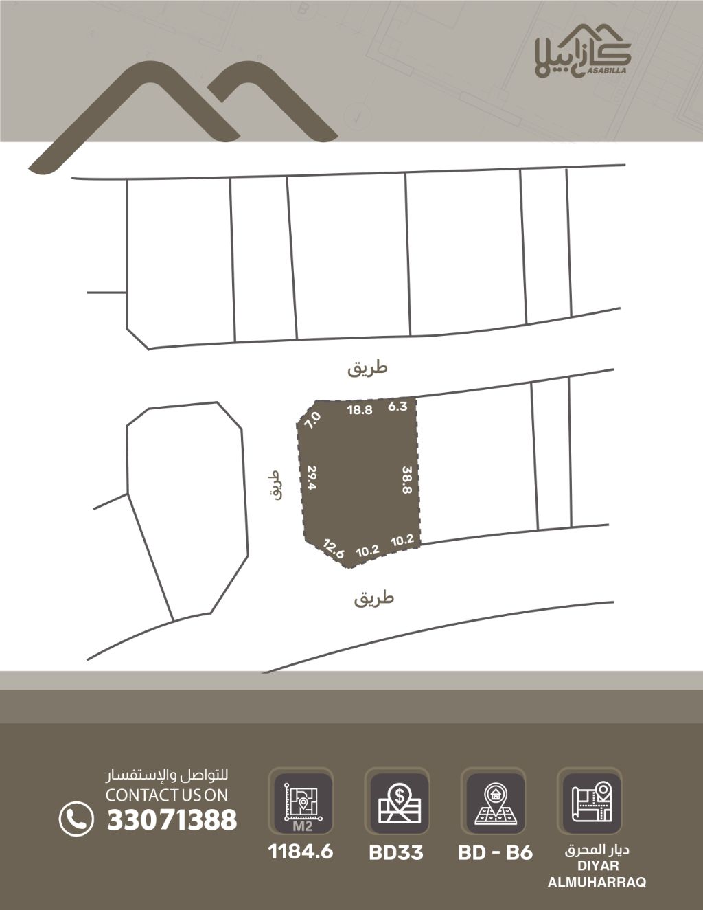 For sale: A freehold land for all nationalities in a prime location in Diyar Al Muharraq area, suitable for building a residential investment project. Classification: BD - B6. Area: 1184.6 square meters. Number of streets: 3 streets. Price per square foot: 33 dinars. Total price: 420,784 thousand dinars. For contact and inquiries.