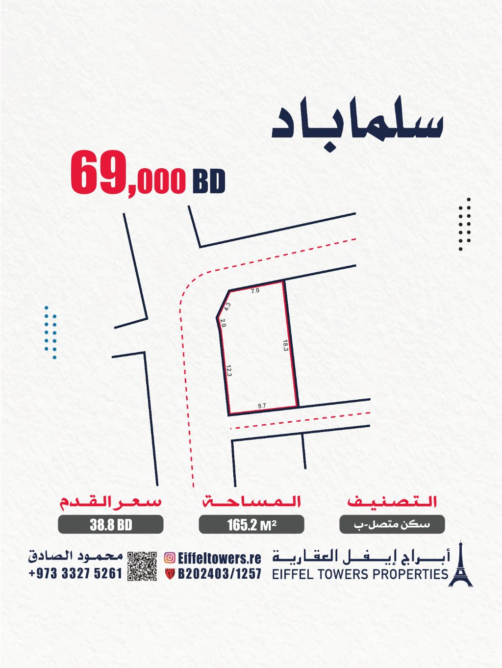 Eiffel Towers Real Estate Company offers for sale a land in Salmabad with an area of 165.2 square meters, classified as residential attached (with RHB). The price per square foot is 38.8 Bahraini dinars, and the total price is 69,000 Bahraini dinars. For contact, reach out to Mahmoud Al-Sadiq via eiffeltowers.re. The company is a licensed broker approved by the Real Estate Regulatory Authority, license number B202403/1257.