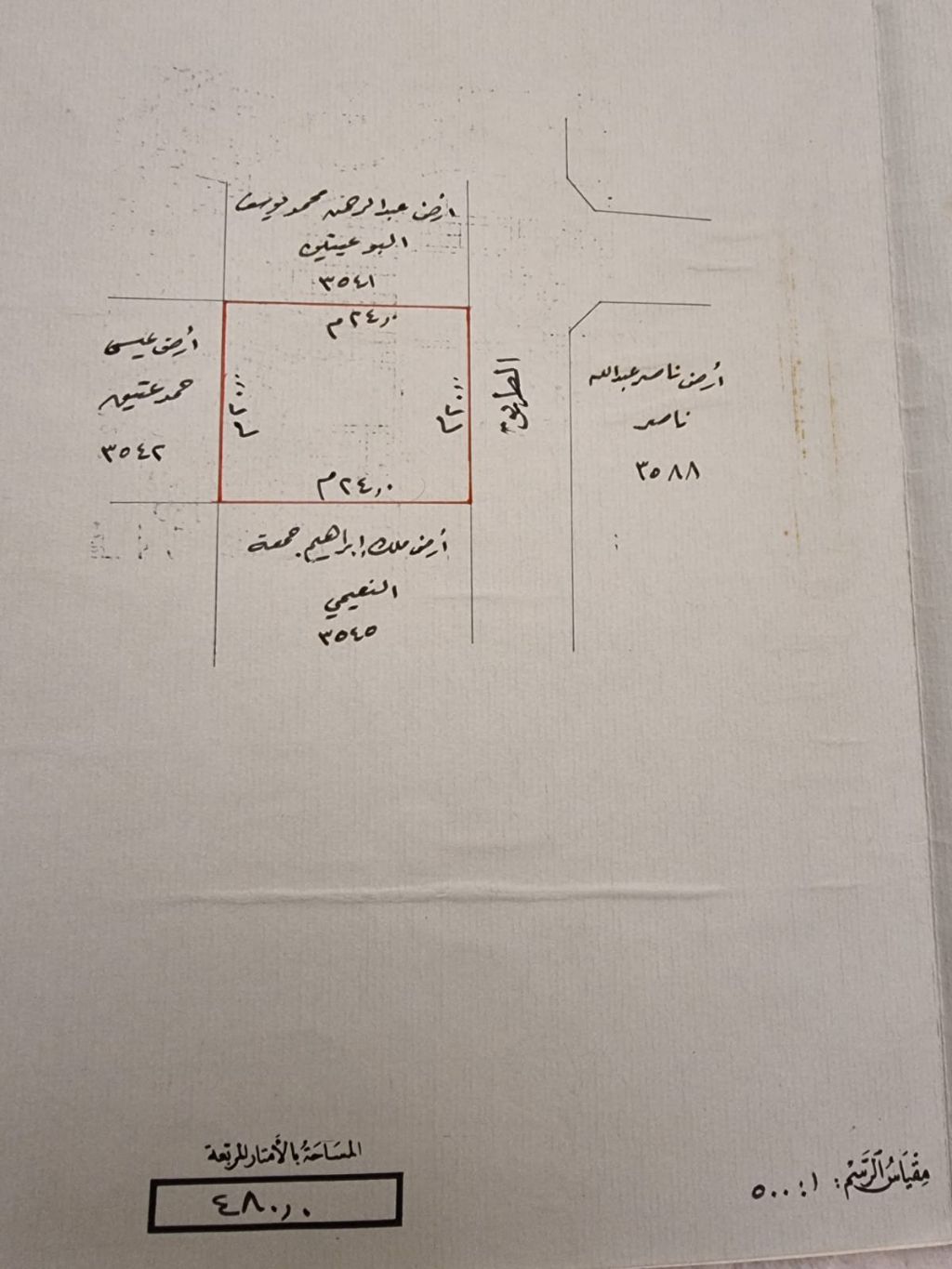 For sale, a land in Arad on a street, area 480 square meters, price per foot 28 dinars, total price 144,600 dinars.