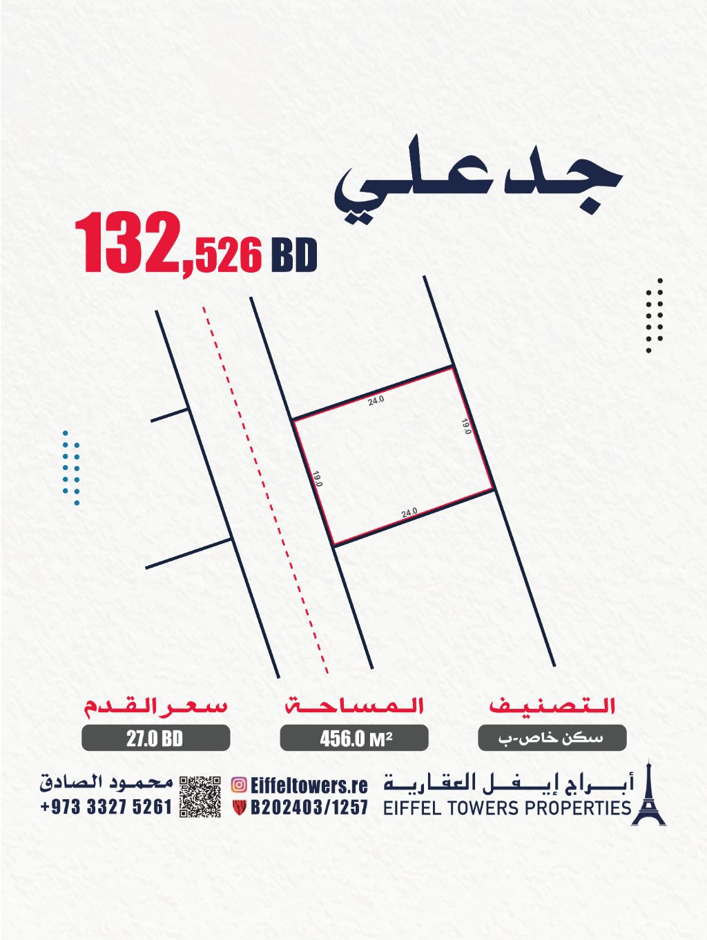 Eiffel Towers Real Estate Company offers for sale a land plot in Jid Ali with an area of 456 square meters. Classification: Private Residential (RB). Price per square foot: 27 Bahraini dinars. Total price: 132,526 Bahraini dinars. For contact: Mahmoud Al-Sadiq, eiffeltowers.re, eiffeltowers.re. Licensed broker approved by the Real Estate Regulatory Authority, license number B202403/1257.