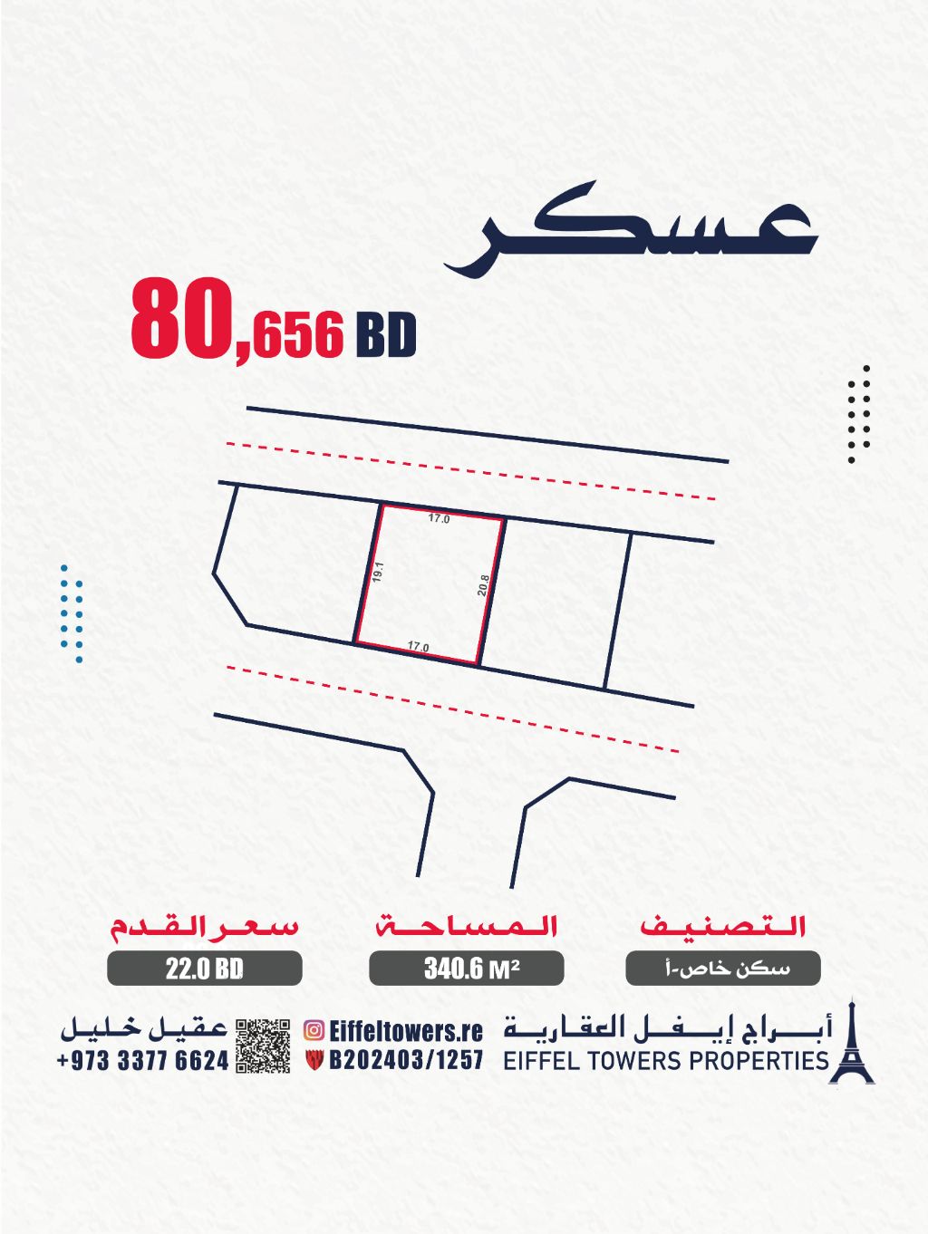 Eiffel Towers Real Estate Company offers for sale a land in Askar with an area of 340.6 square meters, classified as private residential (A RA). The price per square foot is 22 Bahraini dinars, and the total price is 80,656 Bahraini dinars. For contact, reach out to Aqeel Khalil at eiffeltowers-re. The company is a certified broker licensed by the Real Estate Regulatory Authority under license number B202403/1257.