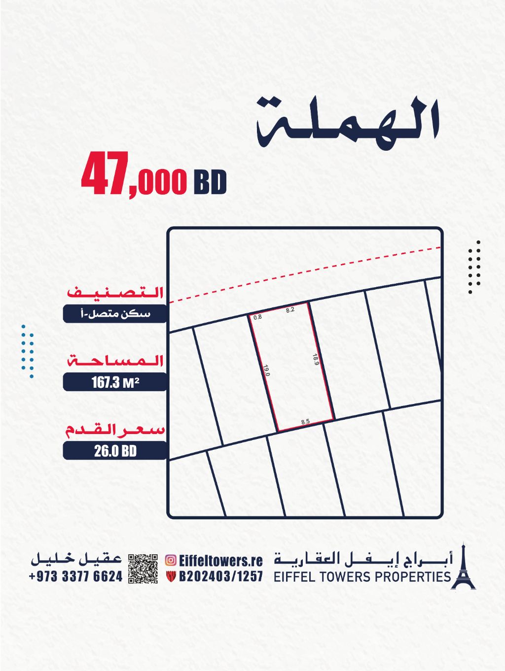 Eiffel Towers Real Estate Company offers for sale a land in Al Hamla with an area of 167.3 square meters, classified as residential attached (ARHA). The price per square foot is 26 Bahraini dinars, and the total price is 47,000 Bahraini dinars. For contact, call Aqeel Khalil. Eiffel Towers Real Estate is a certified broker by the Real Estate Regulatory Authority, license number B202403/1257.