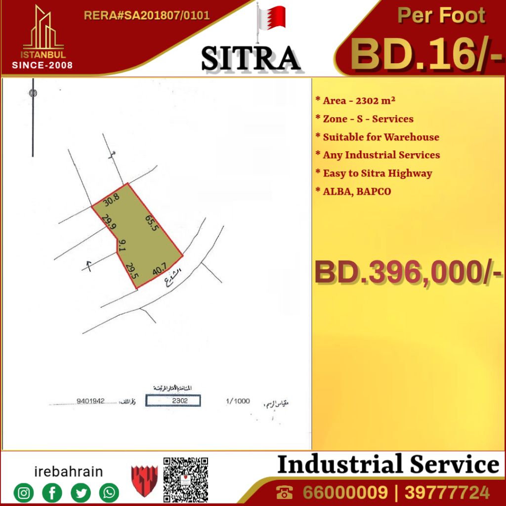 Commercial land for sale in Sitra, Al Mahazah, at a price of 16 Bahraini dinars per square foot. This land is located in the Sitra Industrial Area, Al Mahazah, near Al Moayyed warehouses, Cavalani, Gram Co., and others. The land area is 2302 square meters, classified as a services zone, and suitable for warehouses or any industrial service activities. The price per square foot is 16 Bahraini dinars, making the total price 396,000 Bahraini dinars negotiable. Easy access to Sitra Highway, Alba, Bab Co., and others.