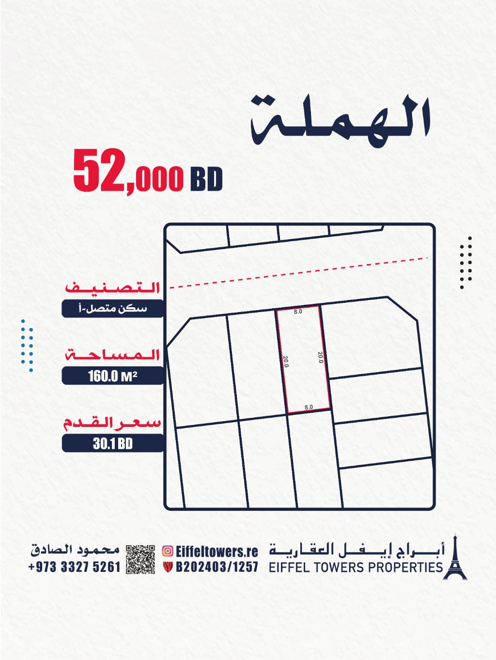 Eiffel Towers Real Estate Company offers for sale a land in Al Hamla with an area of 160 square meters, classified as residential connected (A RHA). The price per square foot is 30.1 Bahraini dinars, and the total price is 52,000 Bahraini dinars. For contact, reach out to Mahmoud Al-Sadiq via eiffeltowers.re. The company is an accredited broker by the Real Estate Regulatory Authority with license number B202403/1257.