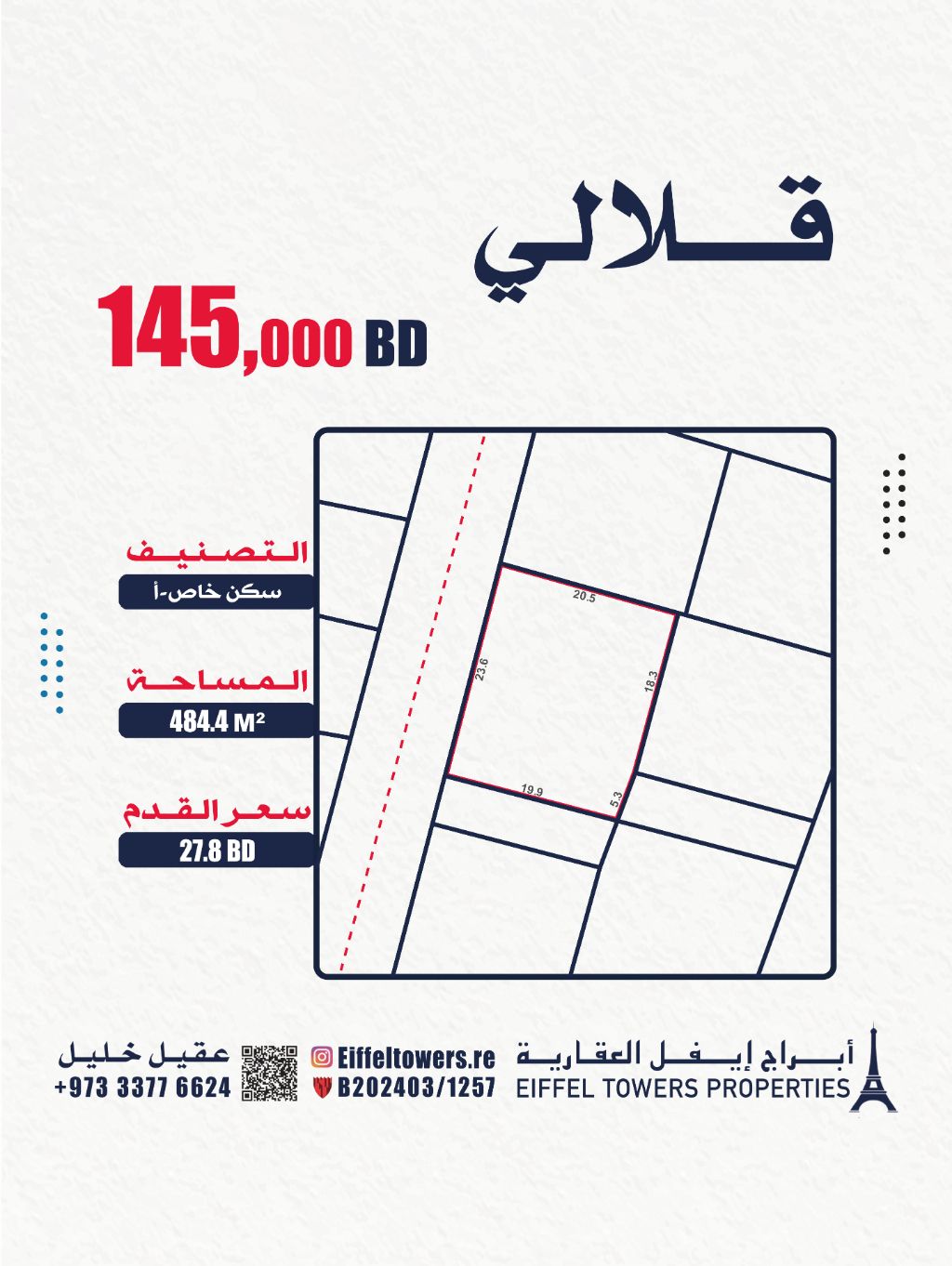 Eiffel Towers Real Estate Company for sale: land in Qalali, area 484.4 m², classification: private residential (A RA), price per foot: 27.8 BD, total price: 145,000 BD. For contact: Aqeel Khalil, eiffeltowers-re, eiffeltowers.re, licensed broker approved by the Real Estate Regulatory Authority, license number: B202403/1257.