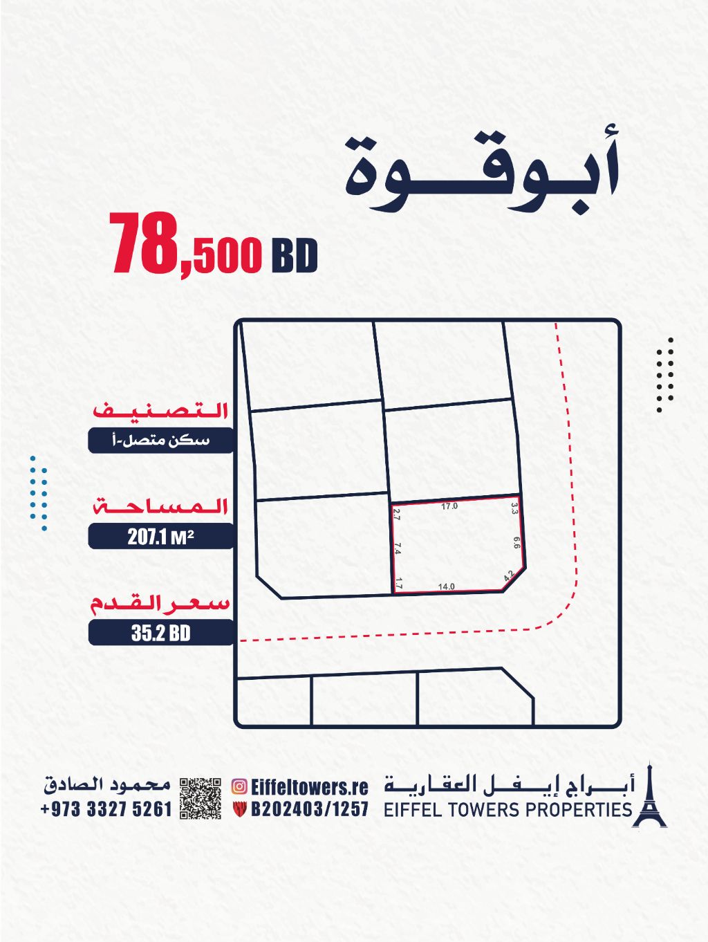 Eiffel Towers real estate Company offers for sale a land plot in Abu Quwa, with an area of 207.1 SQM, classified as residential attached (ARHA) price per square foot 35.2BD, total price BD78500. For contact Mahmoud Al Sadiq, eiffeltowers. re, licensed broker by the real estate Regulatory Authority, license number B202403/ 1257