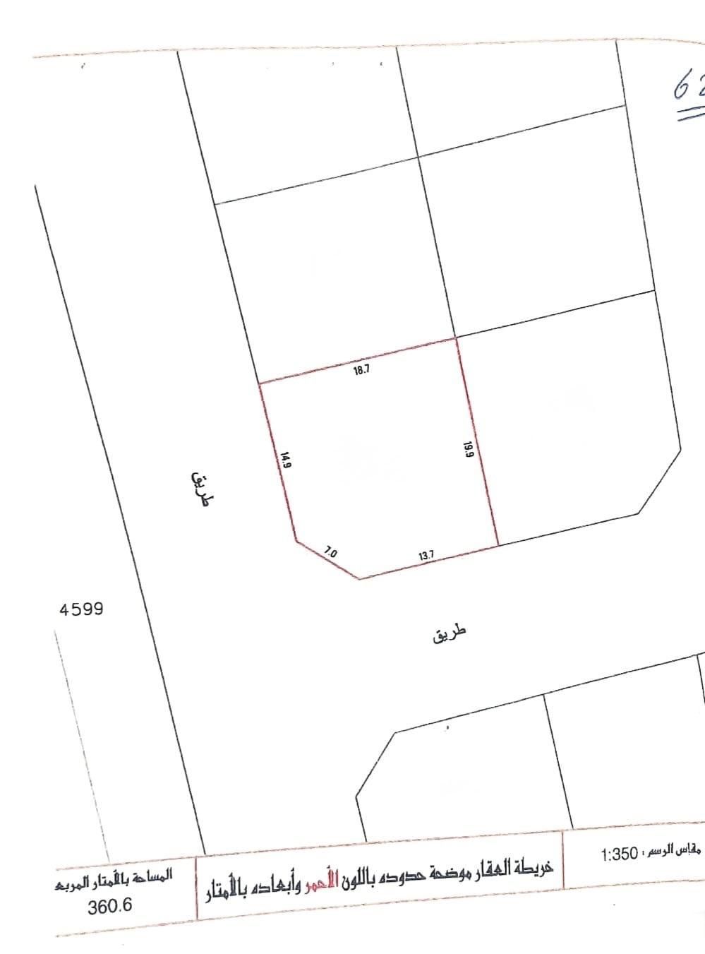 For sale: A land plot in the Sadd Makhutab Bawabat Dilmun area, with an area of 360.6 square meters, located on two streets and a corner. Classification: RA. Close to Al-Hali markets. Price per square foot: 28.5. Total price: 110,623 thousand dinars. Abdul Fattah Hassan, Future Path Real Estate Office. All properties required directly from the owner.