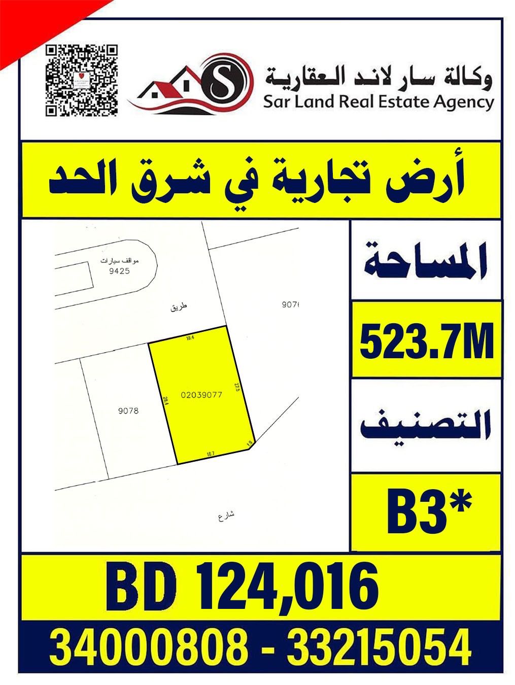 Commercial land in East Hadd, excellent location with complete infrastructure, area 523.7 meters, classification B3, price 124,016 thousand dinars, agency Sar Land Real Estate.