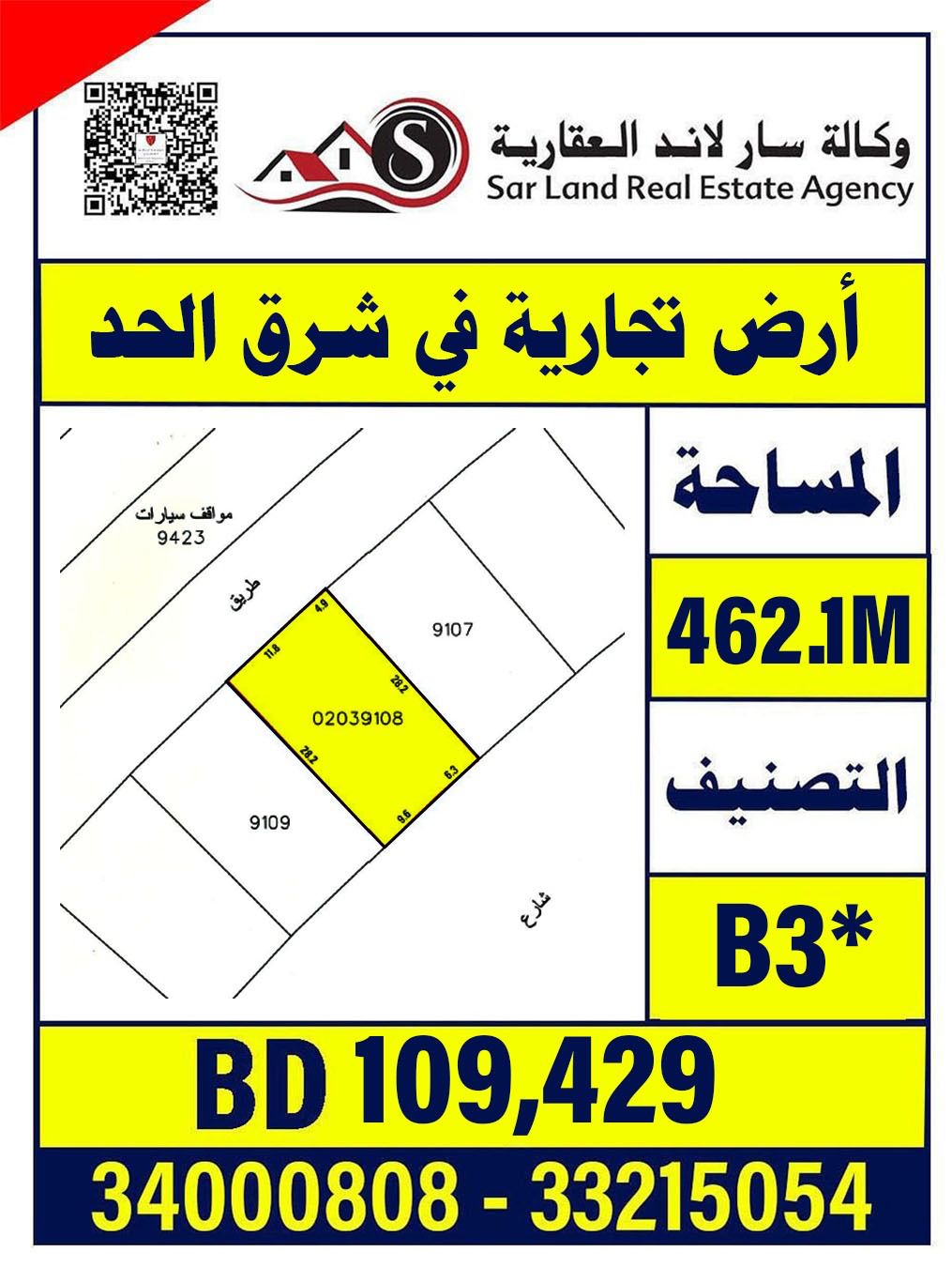 Commercial land in East Hadd, excellent location, complete infrastructure, area 462.1 square meters, classification B3, price 109,429 thousand dinars, agency Sar Land Real Estate.