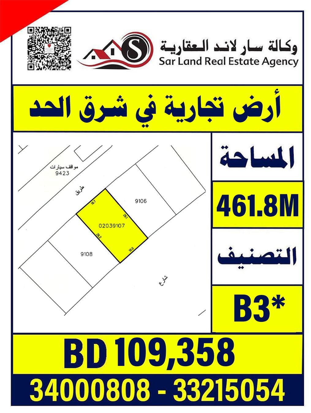 Commercial land in East Hadd, excellent location, complete infrastructure, area 461.8 meters, classification B3, price 109,358 thousand dinars, agency Sar Land Real Estate.
