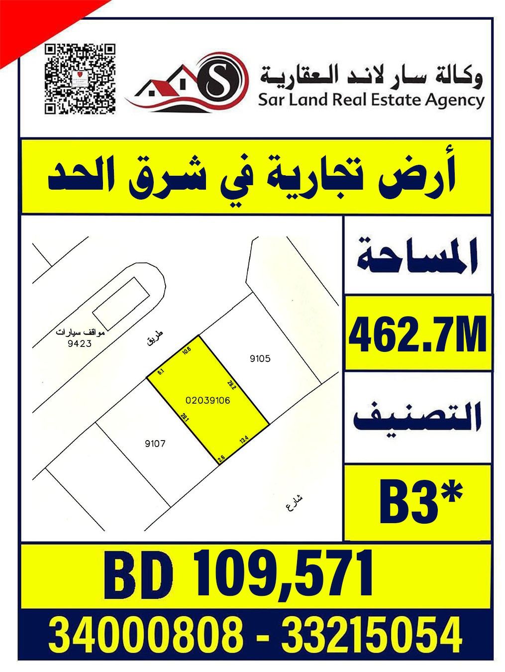 Commercial land in East Hadd, excellent location, complete infrastructure, area 462.7 meters, classification B3, price 109,571 thousand dinars, agency Sar Land Real Estate.