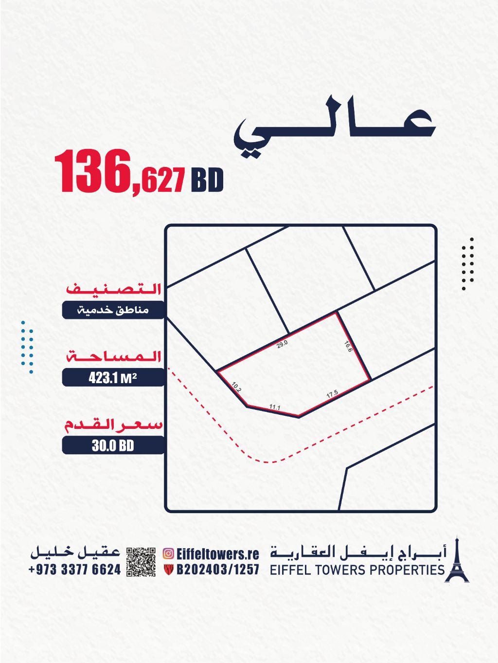 Eiffel Towers Real Estate Company offers for sale a high-area land of 423.1 square meters, classified as service areas - S, with a price per foot of 30 Bahraini dinars and a total price of 136,627 Bahraini dinars. For contact: Aqeel Khalil, eiffeltowers.re, a licensed broker approved by the Real Estate Regulatory Authority, license number B202403/1257.