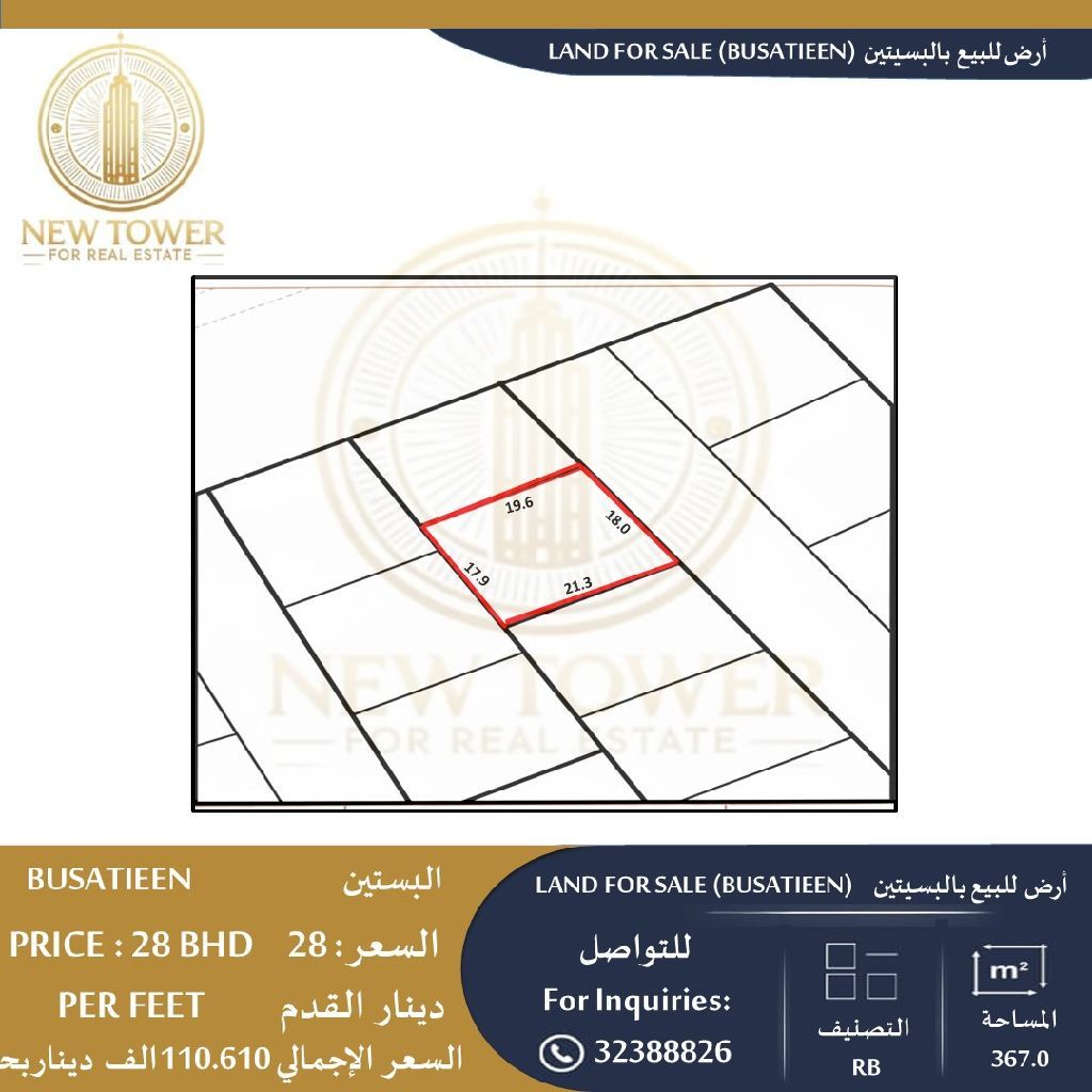 For sale: Residential investment land in Al-Busaiteen, classified as RB, suitable for building. Area: 367 square meters. Price per square foot: 28 dinars. Total price: 110,600 Bahraini dinars. For contact: New Tower Real Estate Office.