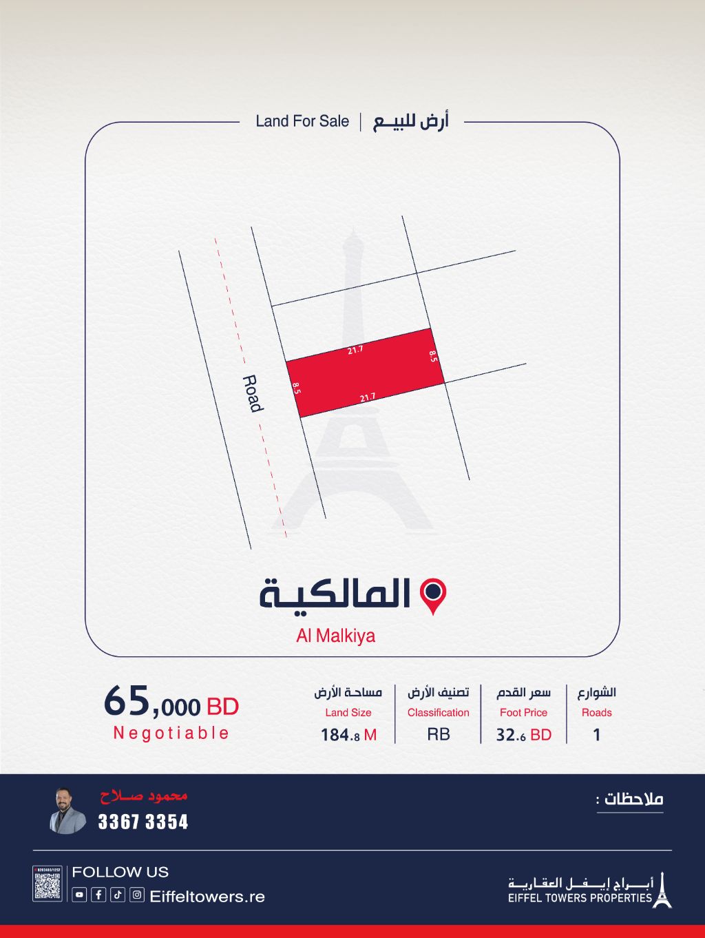 Eiffel Towers Real Estate Company offers for sale a land in Al-Malikiyya with an area of 184.4 square meters, classified as private residential (RB). The price per square foot is 32.6 Bahraini dinars, and the total price is 65,000 Bahraini dinars. For contact, reach out to Mahmoud Salah via eiffeltowers.re. The company is a certified broker licensed by the Real Estate Regulatory Authority under license number B202403/1257.