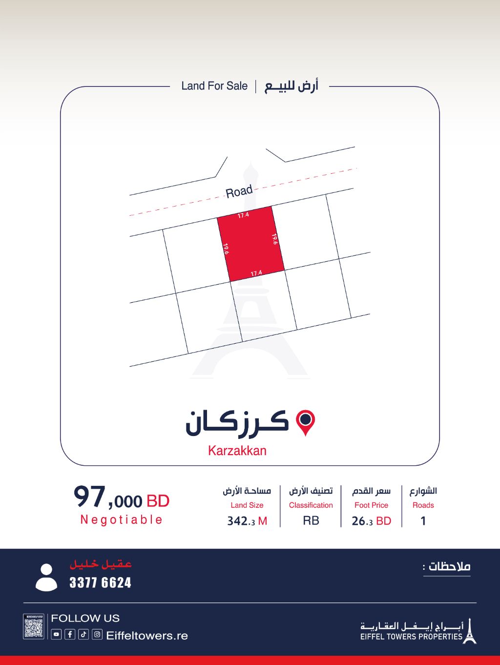 Eiffel Towers Real Estate Company offers for sale a land in Karzakhan with an area of 342.3 square meters, classified as private residential (RB). The price per square foot is 26.32 Bahraini dinars, and the total price is 97,000 Bahraini dinars. For contact, Aqeel Khalil, eiffeltowers.re, eiffeltowers.re, a licensed broker approved by the Real Estate Regulatory Authority, license number B202403/1257.