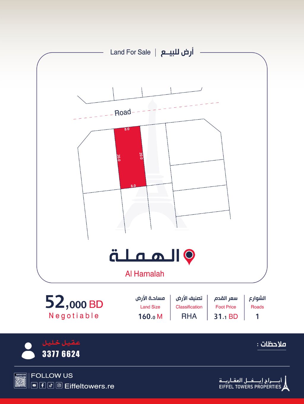 Eiffel Towers Real Estate Company offers for sale a land in Al Hamla with an area of 160 square meters, classified as residential connected (A RHA). The price per square foot is 30.1 Bahraini dinars, and the total price is 52,000 Bahraini dinars. For contact, reach out to Aqeel Khalil via eiffeltowers.re. The company is a certified broker licensed by the Real Estate Regulatory Authority under license number B202403/1257.