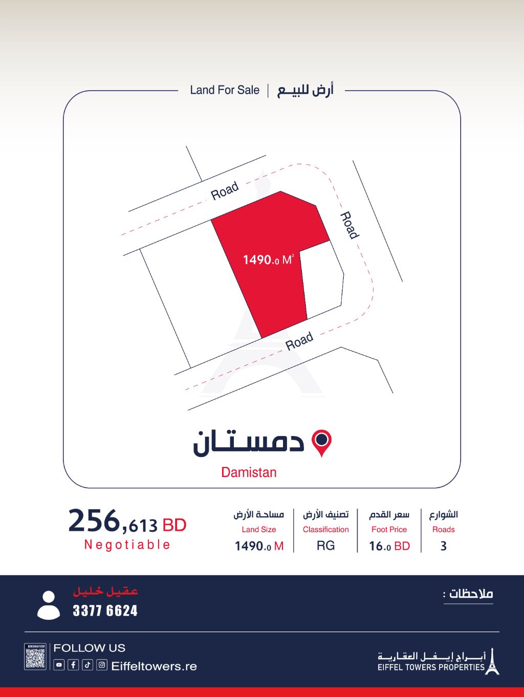 Eiffel Towers Real Estate Company offers for sale a land in Damistan with an area of 1490 square meters, classified as residential garden - RG, price per foot 16 BD, total price 256,613 BD. For contact: Aqeel Khalil, eiffeltowers.re, a licensed broker approved by the Real Estate Regulatory Authority, license number B202403/1257.