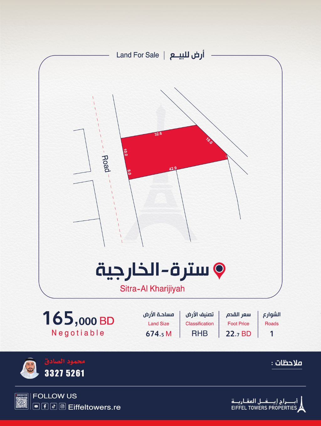 Eiffel Towers Real Estate Company offers for sale a land in Sitra (External) with an area of 674.5 square meters. Classification: Residential Connected (with RHB). Price per square foot: 22.7 Bahraini dinars. Total price: 165,000 Bahraini dinars. For contact: Mahmoud Al-Sadiq, eiffeltowers.re, eiffeltowers.re. Licensed broker approved by the Real Estate Regulatory Authority, license number B202403/1257.