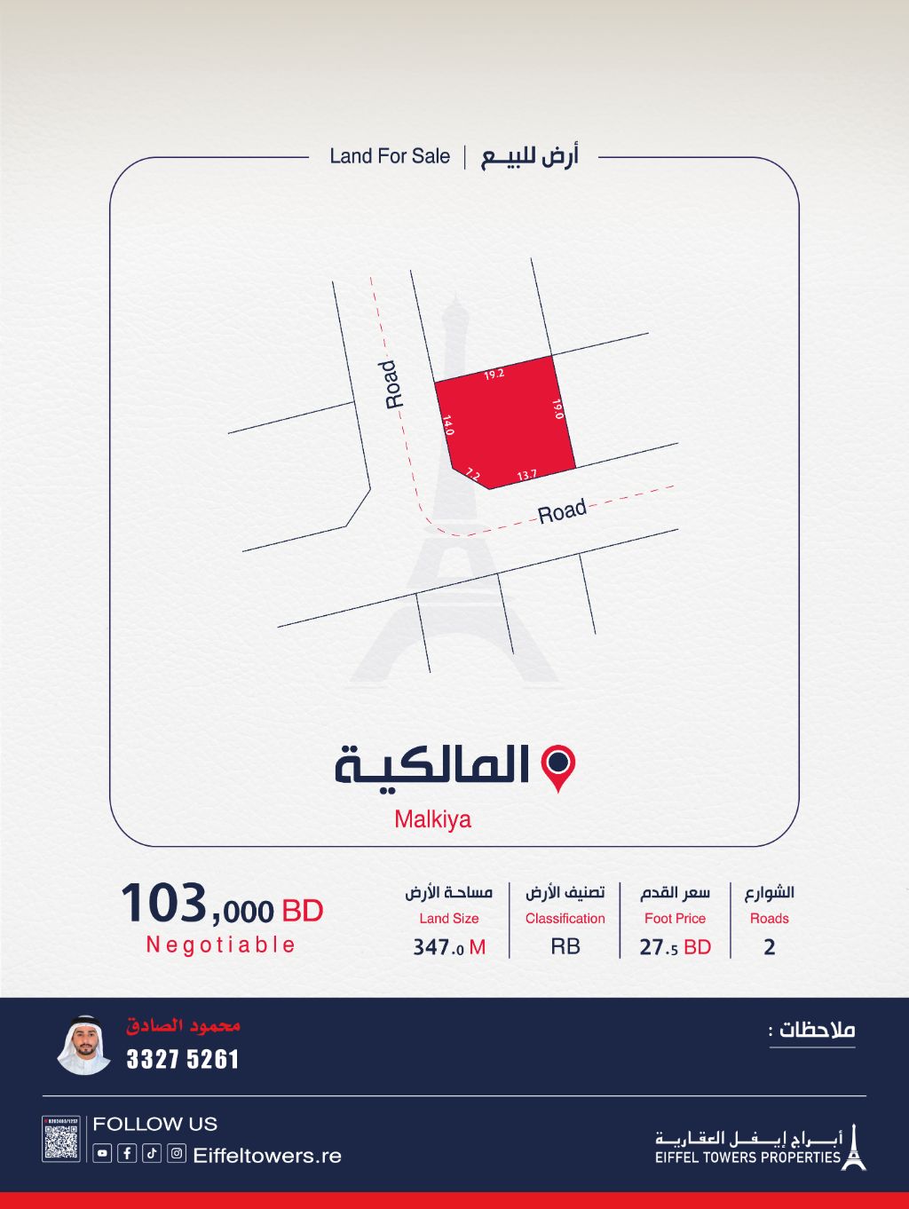Eiffel Towers Real Estate Company offers for sale a land in Al-Malikiyya with an area of 347 square meters, classified as private residential (RB). The price per square foot is 27.5 Bahraini dinars, and the total price is 103,000 Bahraini dinars. For contact, reach out to Mahmoud Al-Sadiq via eiffeltowers.re. The company is a certified broker licensed by the Real Estate Regulatory Authority under license number B202403/1257.