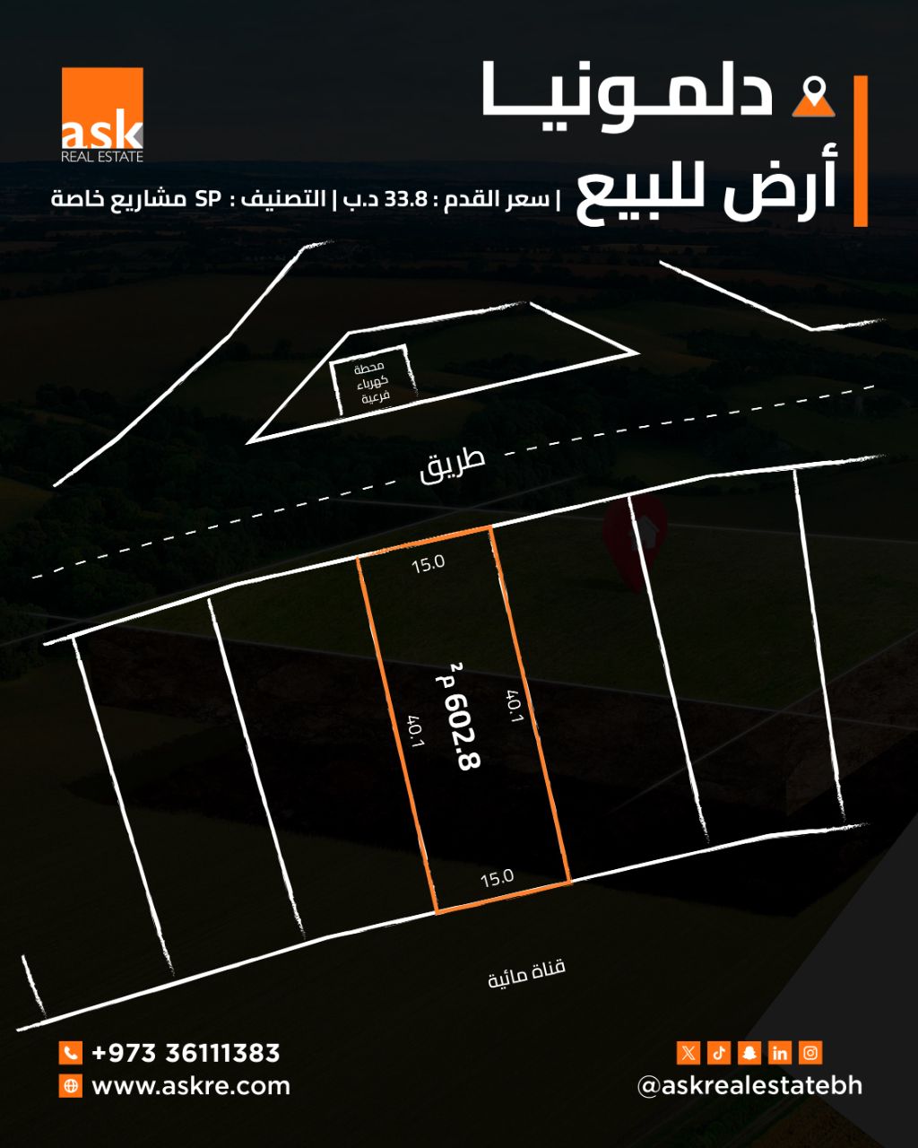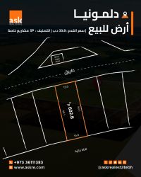 For sale, an exceptional land directly on the sea - Dilmunia. A distinctive land with a rare strategic location in Dilmunia, directly overlooking the sea, within a very quiet area, with the possibility of creating a private jetty for yachts, sea access, and fishing with all comfort. Land area is 602.8 square meters, land classification is SP. Offered price is 220,000 Bahraini dinars, negotiable reasonably for serious buyers only. Price per square foot is 34 dinars. Land features: ready for construction, includes a basement utilized for parking and services.