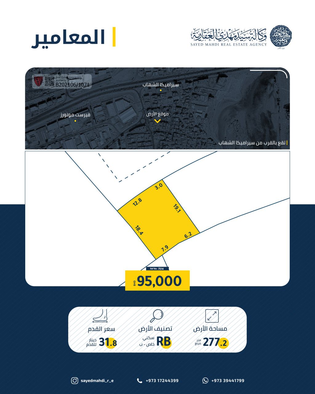 A residential land for sale in Al Ma'ameer, classified as private residential area (B). Area: 277.2 square meters. Price per foot: 31 BD. Total price: 95,000 BD, negotiable. Streets: 1.