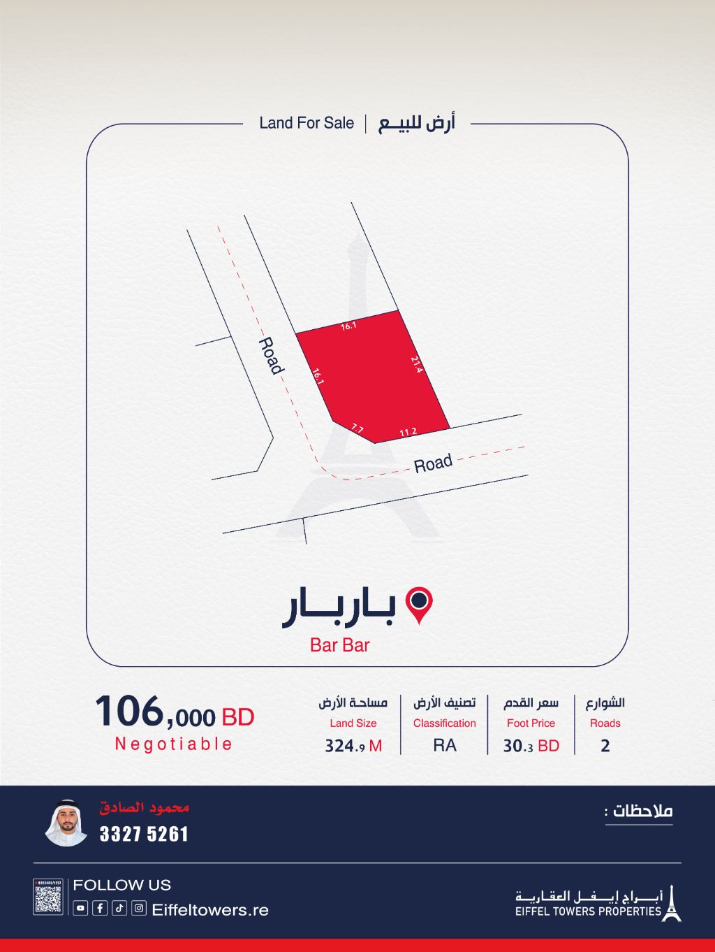 Eiffel Towers Real Estate Company for sale: land in Barbar, area 324.9 m², classification: private residential (A RA), price per foot 30.3 BD, total price 106,000 BD. For contact: Mahmoud Al-Sadiq, eiffeltowers.re, eiffeltowers.re, licensed broker approved by the Real Estate Regulatory Authority, license number B202403/1257.