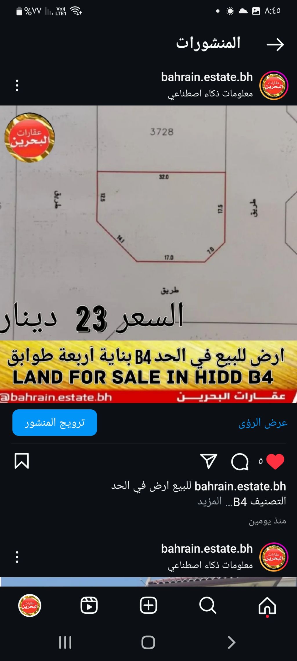 For sale, a land in Al-Hadd, classification B4, price 23 dinars per foot and negotiable, land area 659 square meters.